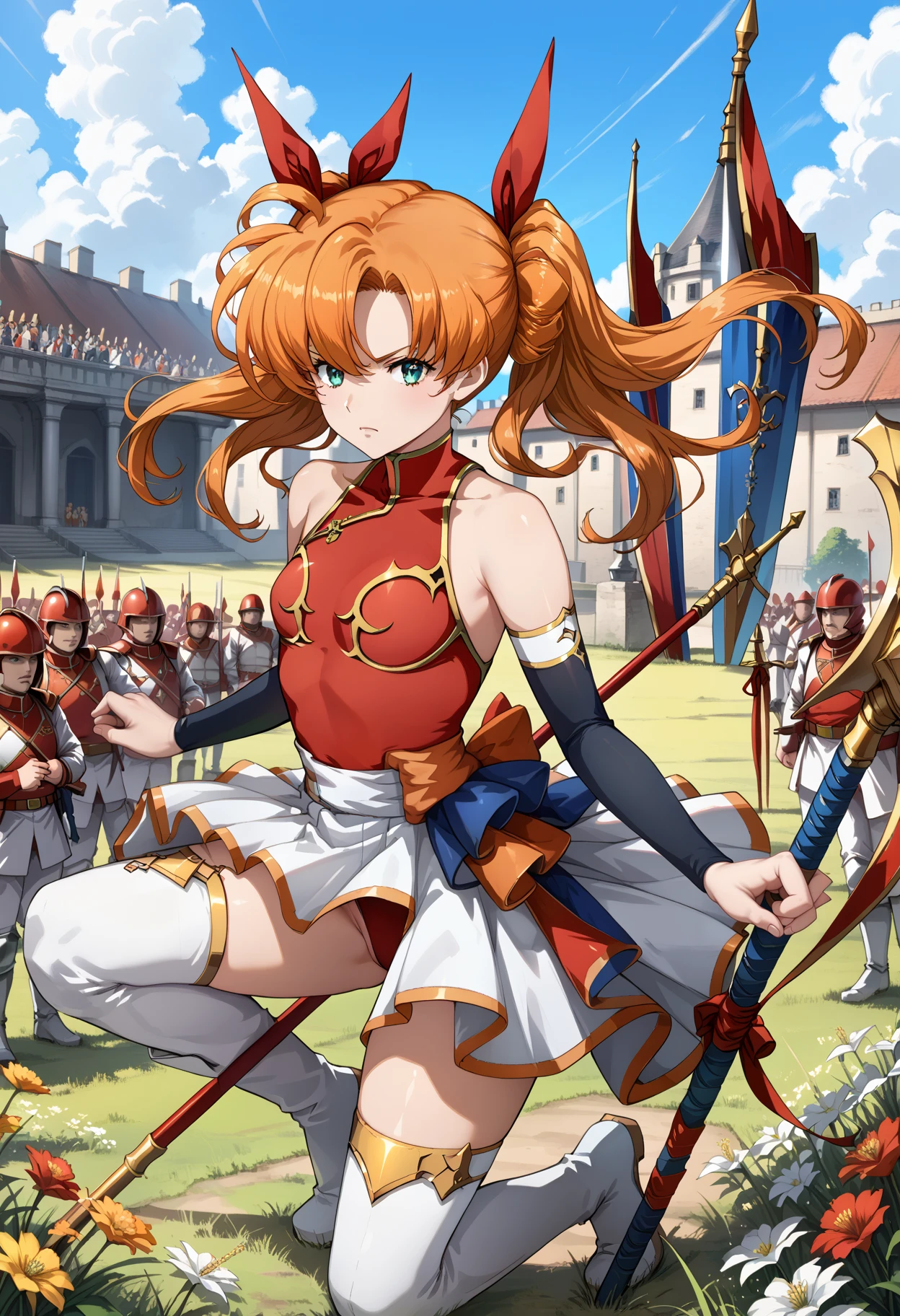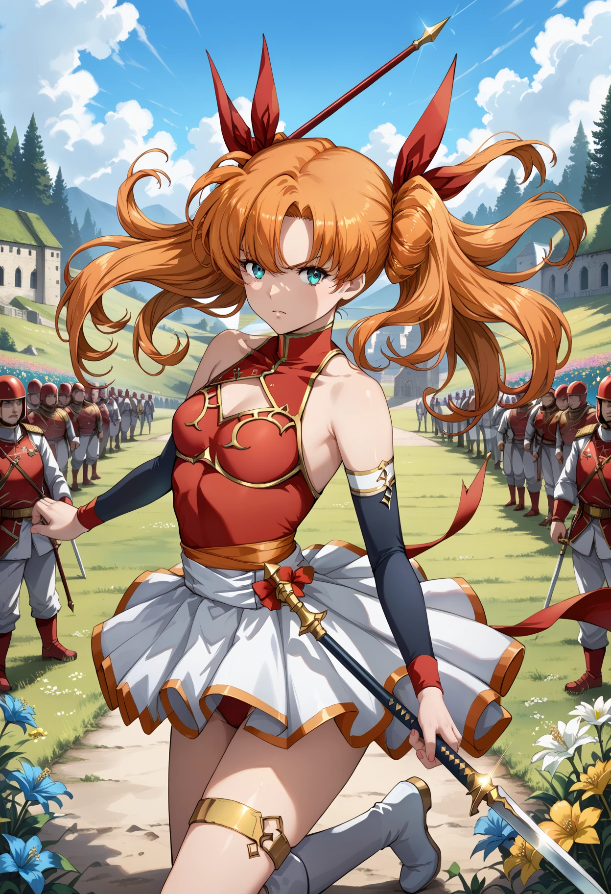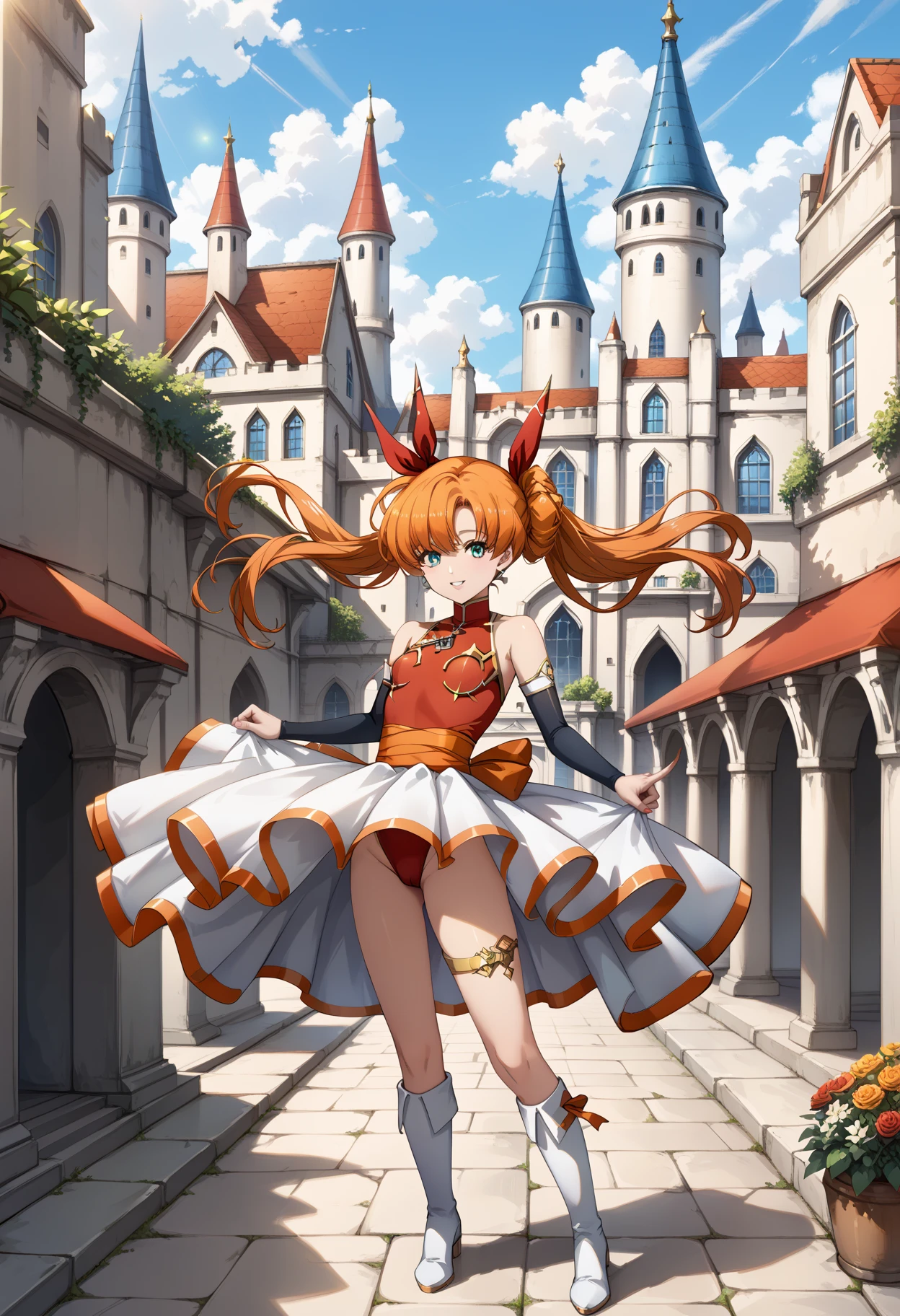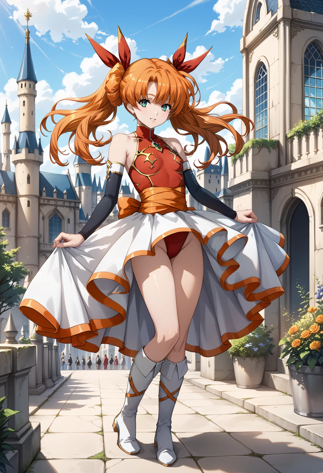 衣装補助ワード・red leotard,detached sleeves,white pleated skirt,white footwear,