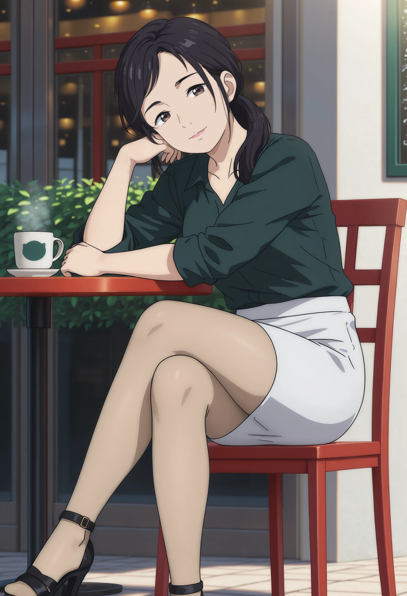 #2: white lab coat, sleeves rolled up, green shirt, white skirt, pencil skirt, skin-colored pantyhose, see-through legwear, black high heels, strappy heels