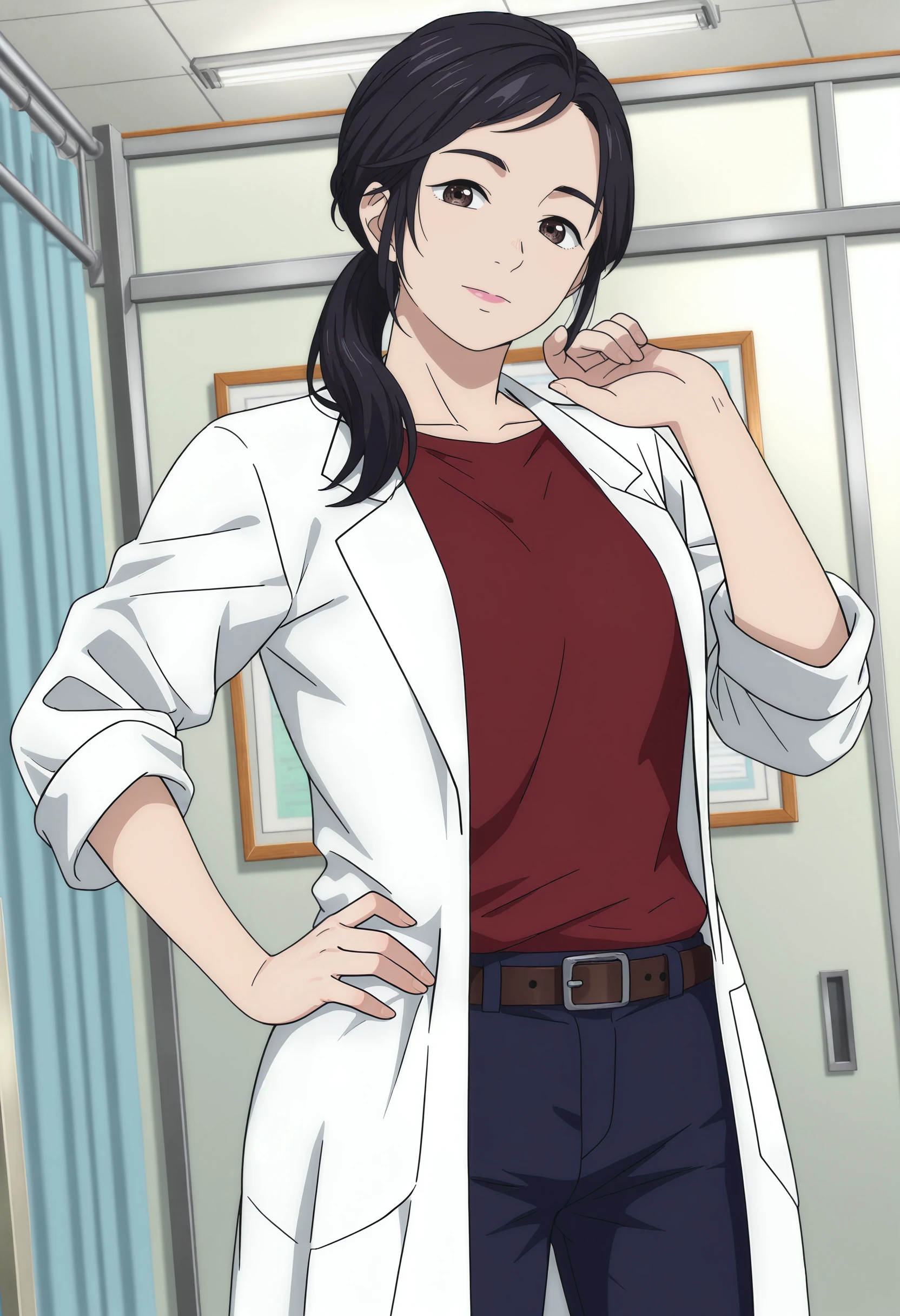 #1: white lab coat, sleeves rolled up, red shirt, brown belt, blue pants, black high heels