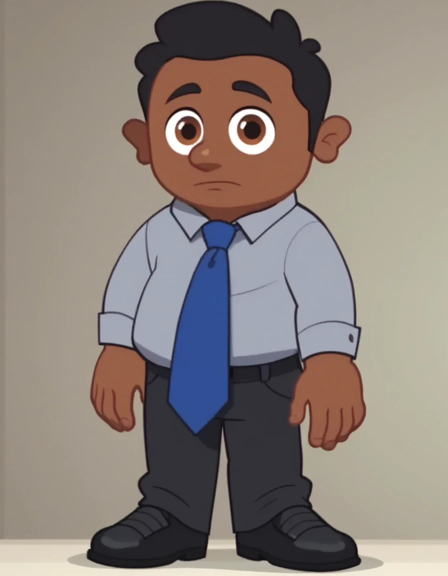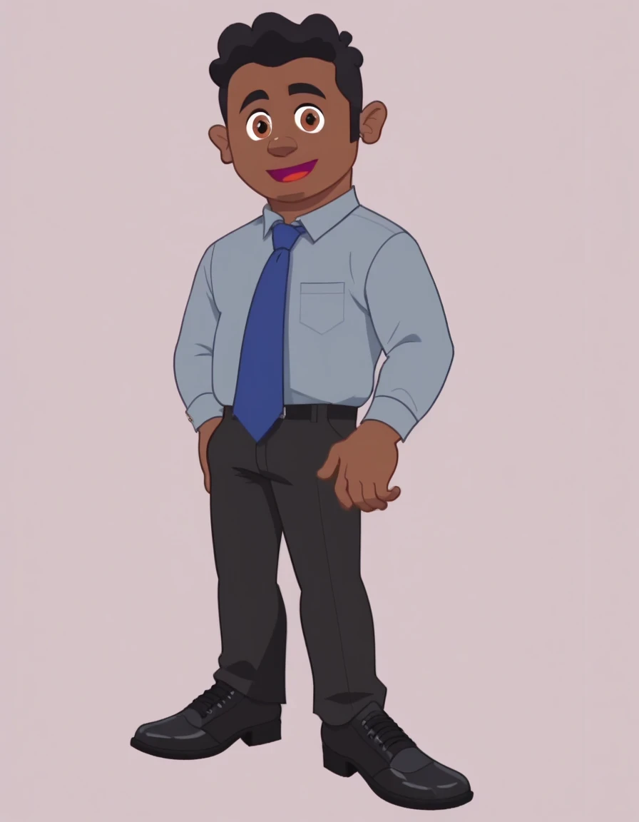 TyroneNutkissSML, shirt, black hair, 1boy, necktie, collared shirt, pants, dark skin, black footwear, black pants, dark-skinned male, blue necktie, grey shirt, brown eyes