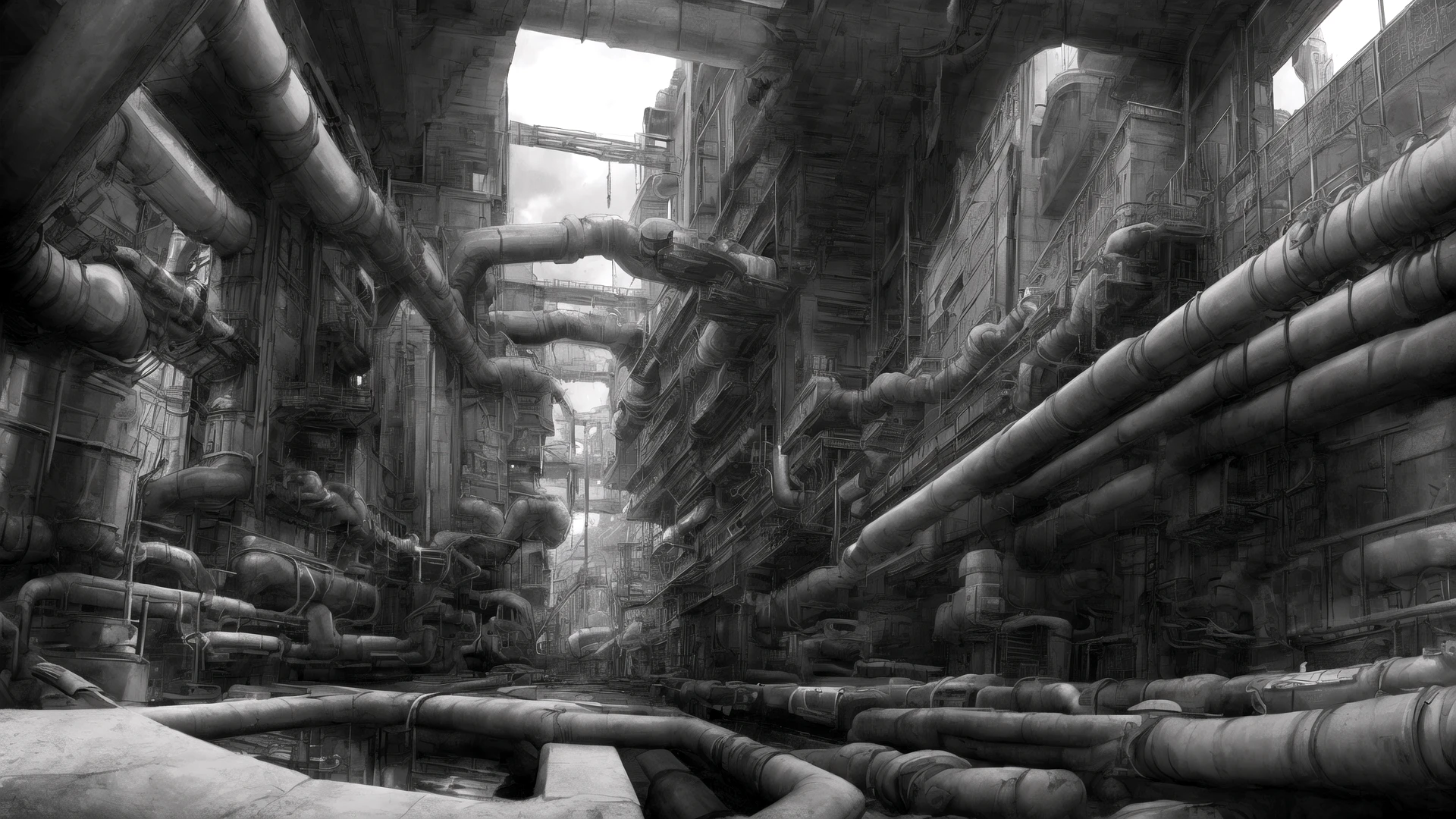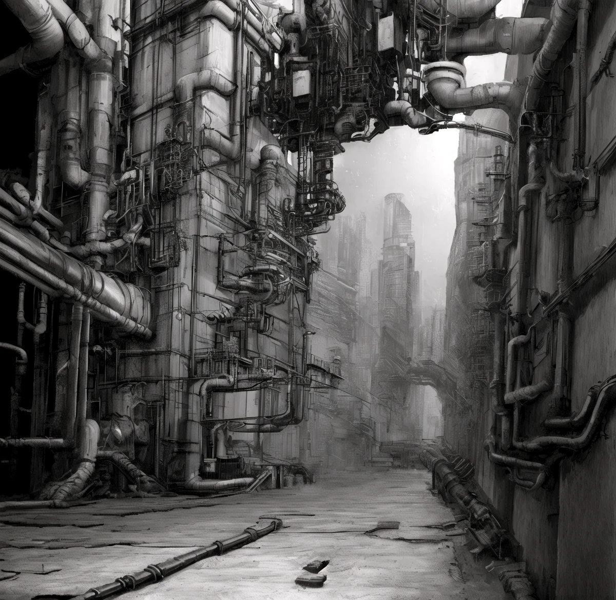 Trigger Words: greyscale, building, industrial pipes, traditional media
