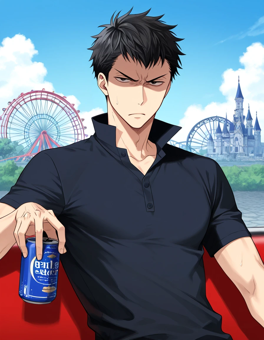 black polo shirt, popped collar,