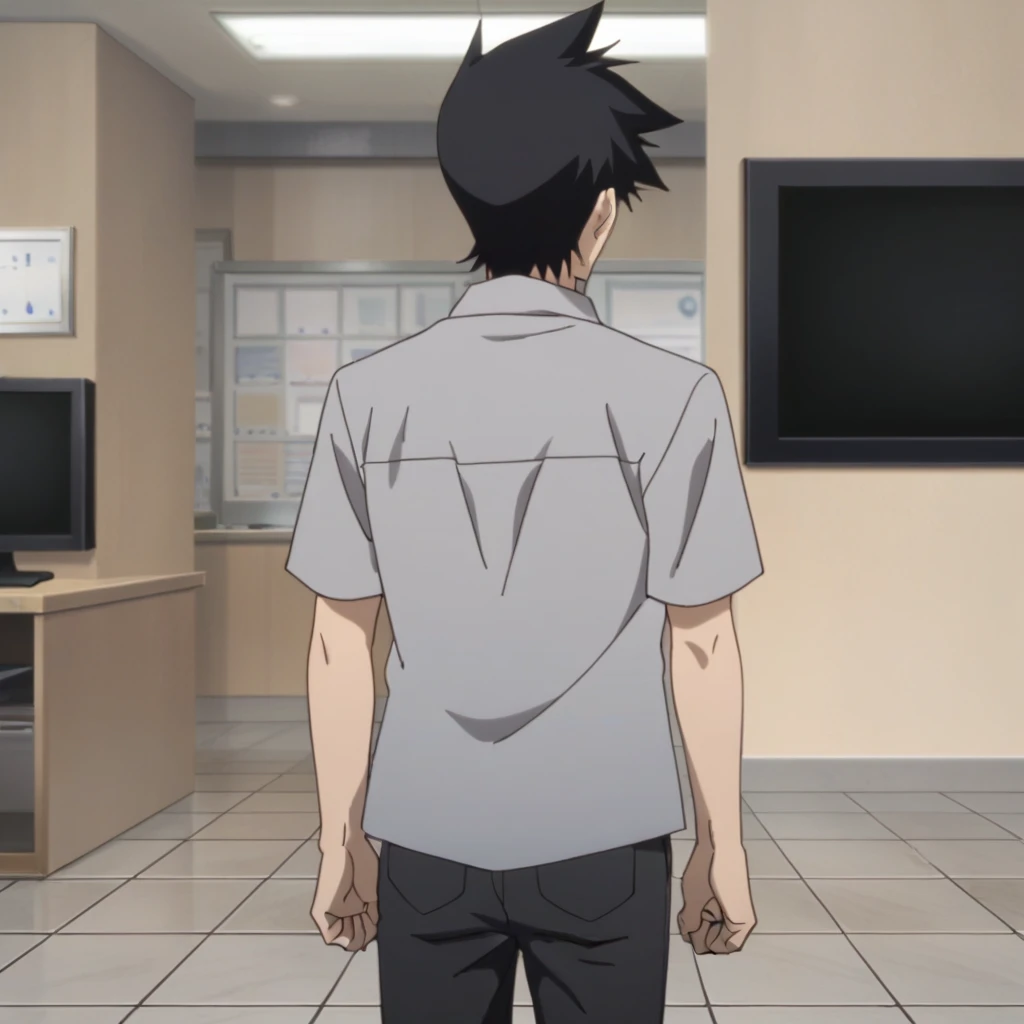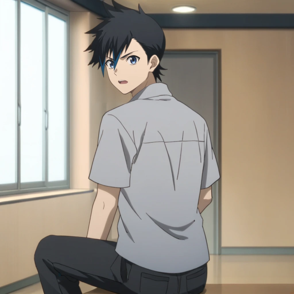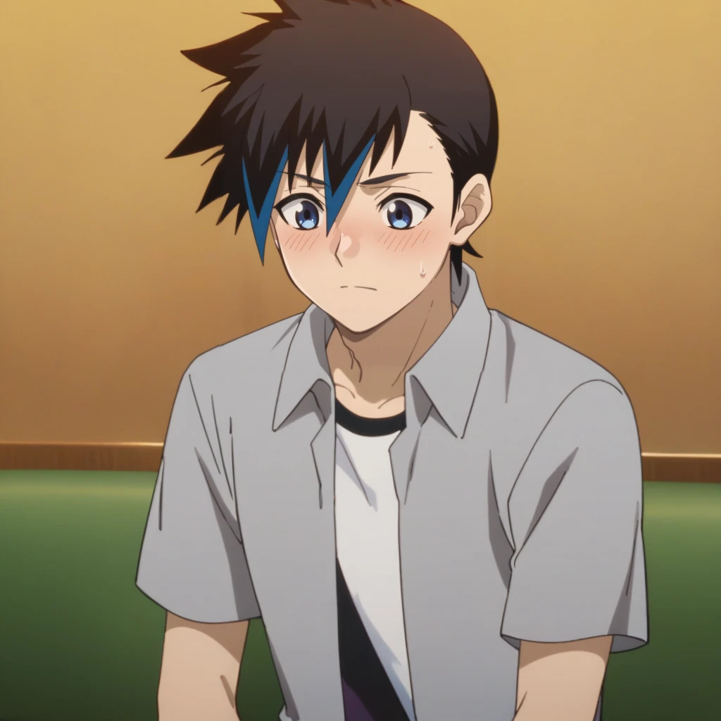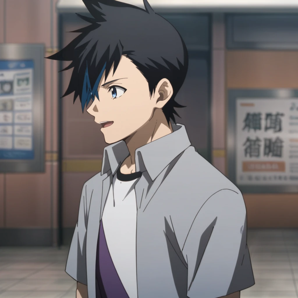 Prompts: male, multicolored hair, two-tone hair, streaked hair, spiked hair, black hair, blue hair, blue eyes, grey collared shirt, undershirt, short sleeves, open clothes, black pants, black footwear, indoors (restaurant/green seat), indoors (train station/sign/magazine rack), indoors (studio/tile floor/monitor/elevator), indoors (hallway/ceiling light/window/door), outdoors (city/sky/cloud/building/road/railing/lamppost/tree/hedge/shop), outdoors (neighborhood/blue sky/house/utility pole/power lines/greenery), outdoors (canyon/sunlight)