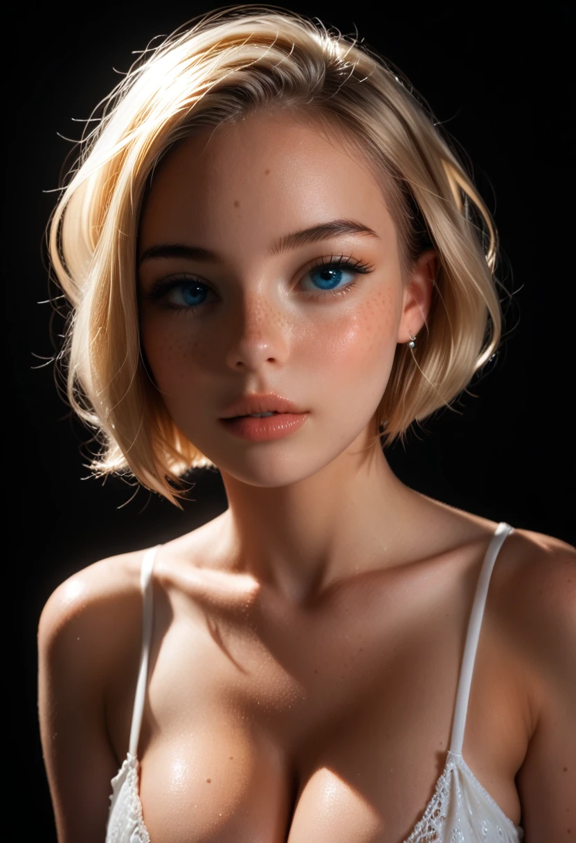 Triggers: (because I didn't figure out how to create the trigger before making it!) - "1girl, blonde hair, blue eyes, breasts, cleavage, freckles, short hair"