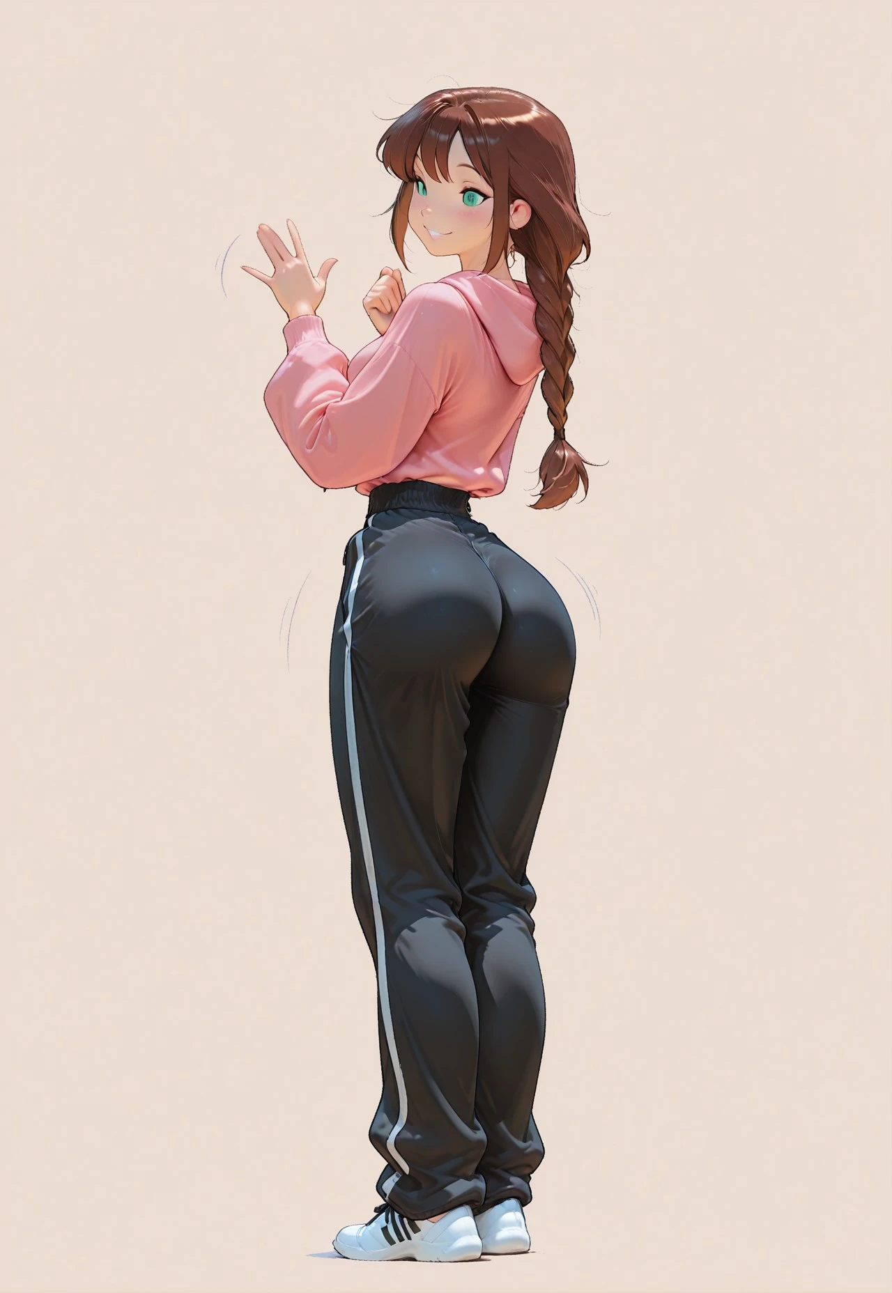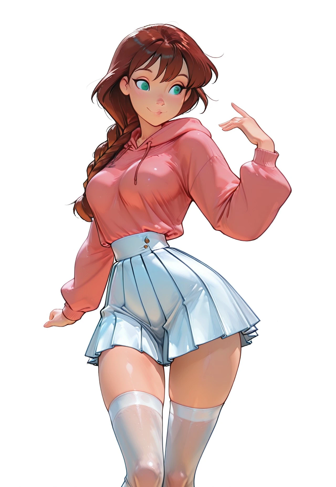 1girl, long braid, brown hair, perfect hairstyle, green eyes, detailed face, subtle curves, pink hoodie, white pleated skirt, white thighhighs