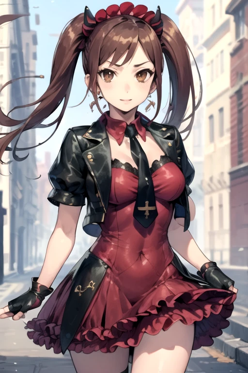 AiKashiwagi, 1girl, solo, long hair, brown hair, fingerless gloves, dress, twintails, brown eyes, jewelry, medium breasts, jacket, short sleeves, earrings, frills, necktie, striped, detached collar,