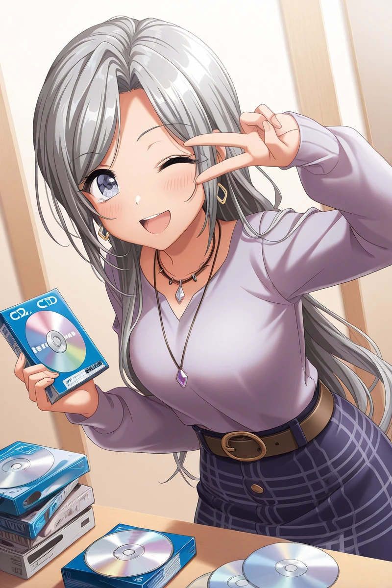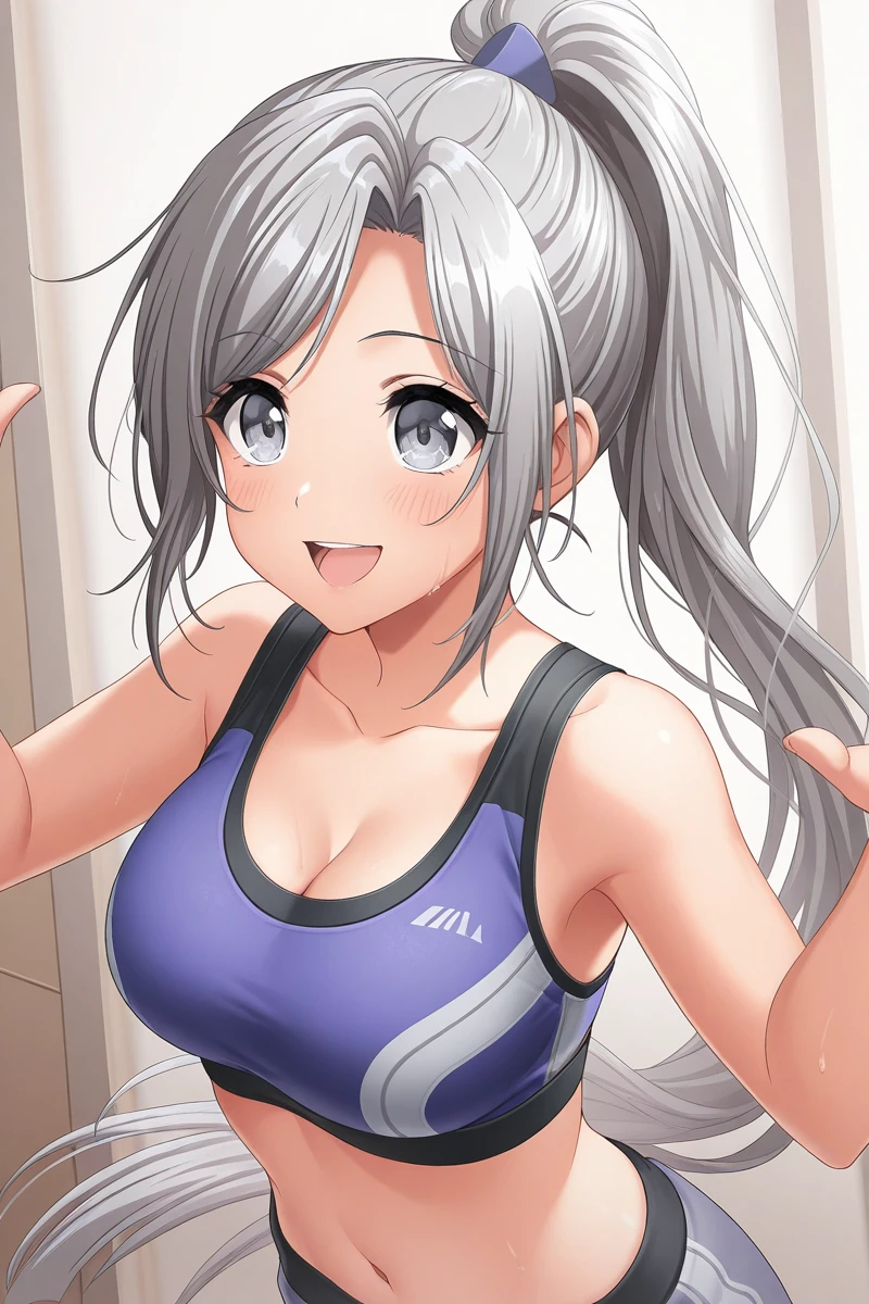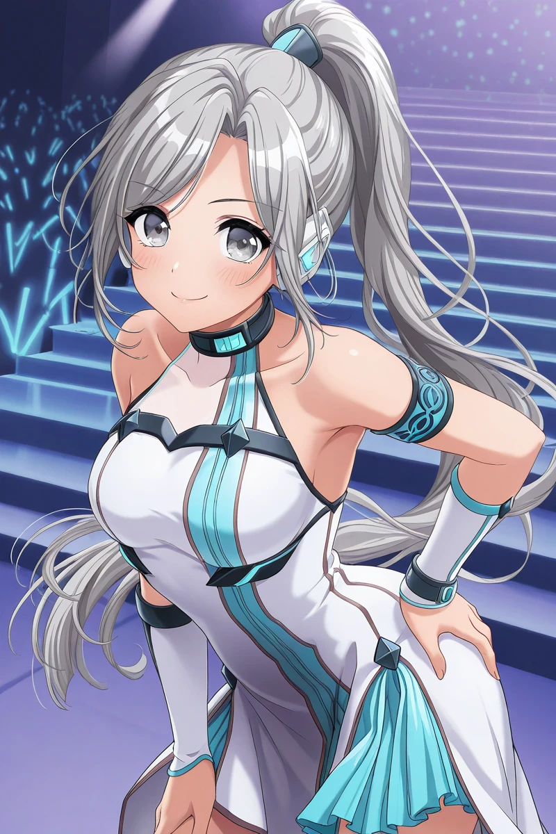 ibuki, 1girl, solo, long hair, grey hair, hand on hip, smile, dress, grey eyes, looking at viewer, breasts, ponytail, stage outfit, on stageSchool uniform Ibuki: