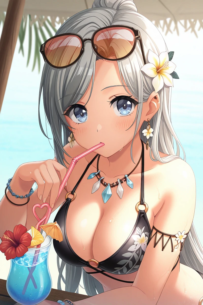 ibuki, 1girl, breasts, swimsuit, drinking straw, solo, jewelry, long hair, cleavage, bikini, eyewear on head, flower, black bikini, blue eyes, looking at viewer, earrings, holdingDescription