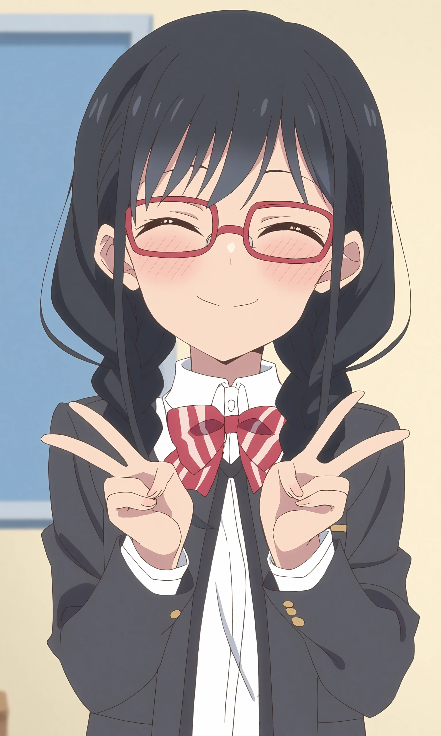 Rin, glasses, braid, black hair, twin braids, blue eyes, red-framed eyewear, looking at viewer, long hair, bangs,