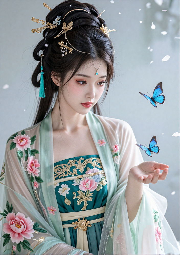 ZitCNGufHanfu, A young woman with dark, intricately styled hair adorned with golden filigree, a delicate chain headpiece, and turquoise tassels gazes softly downward. She wears a layered traditional ensemble: a sheer, pale green outer robe embroidered with pink peonies and green leaves over a rich teal bodice detailed in gold floral patterns, cinched with a cream sash and ornate belt. Her right hand is extended palm-up, as if offering or receiving something unseen. Several iridescent blue butterflies hover near her face and hand, while soft white petals drift through the luminous, hazy background. The lighting is gentle and diffused, highlighting her smooth skin and the textures of silk and embroidery, evoking a serene, ethereal atmosphere.