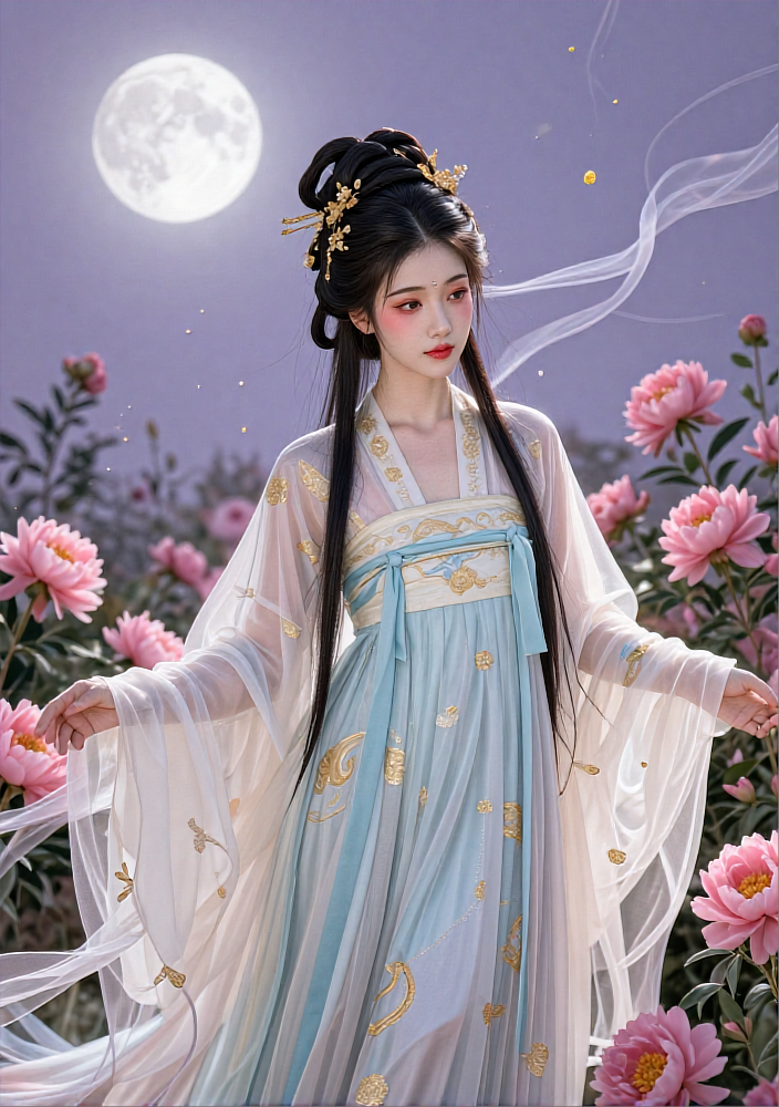 ZitCNGufHanfu, A young woman with long, dark hair styled in an elaborate updo adorned with golden floral ornaments stands serenely amidst a lush garden of pink peonies. She wears a flowing, translucent robe in pale blue and ivory, intricately embroidered with gold patterns and tied at the waist with a wide sash; sheer sleeves billow gently around her arms. Her makeup features soft blush, red lips, and a small bindi-like mark on her forehead. Behind her, a luminous full moon hangs in a dusky lavender sky, while ethereal white ribbons and delicate golden leaves drift through the air. Soft, diffused light illuminates the scene, enhancing the dreamlike, tranquil mood and the delicate textures of fabric and petals.