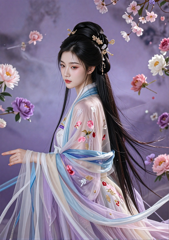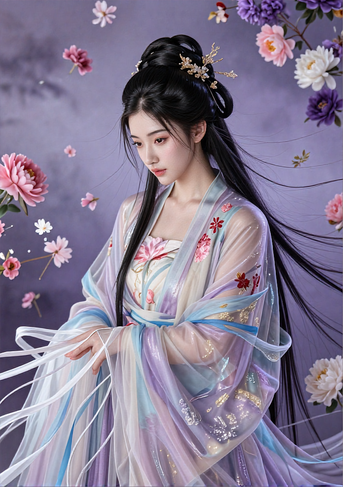 ZitCNGufHanfu, A young woman with long, flowing black hair styled in an elegant updo adorned with delicate golden floral ornaments gazes downward with a serene expression. She wears a translucent, multi-layered robe in soft pastel hues—lavender, pale blue, and cream—with embroidered floral motifs in pink, red, and gold, and subtle shimmering accents. Delicate ribbons of white, blue, and silver fabric swirl around her arms and torso, suggesting gentle movement. Surrounding her are abundant blossoms—pink, purple, and white peonies and cherry blossoms—floating mid-air against a dreamy, misty background of lavender and indigo tones. Soft, diffused lighting enhances the ethereal atmosphere, casting gentle highlights on her skin and garments, evoking tranquility and poetic grace.
