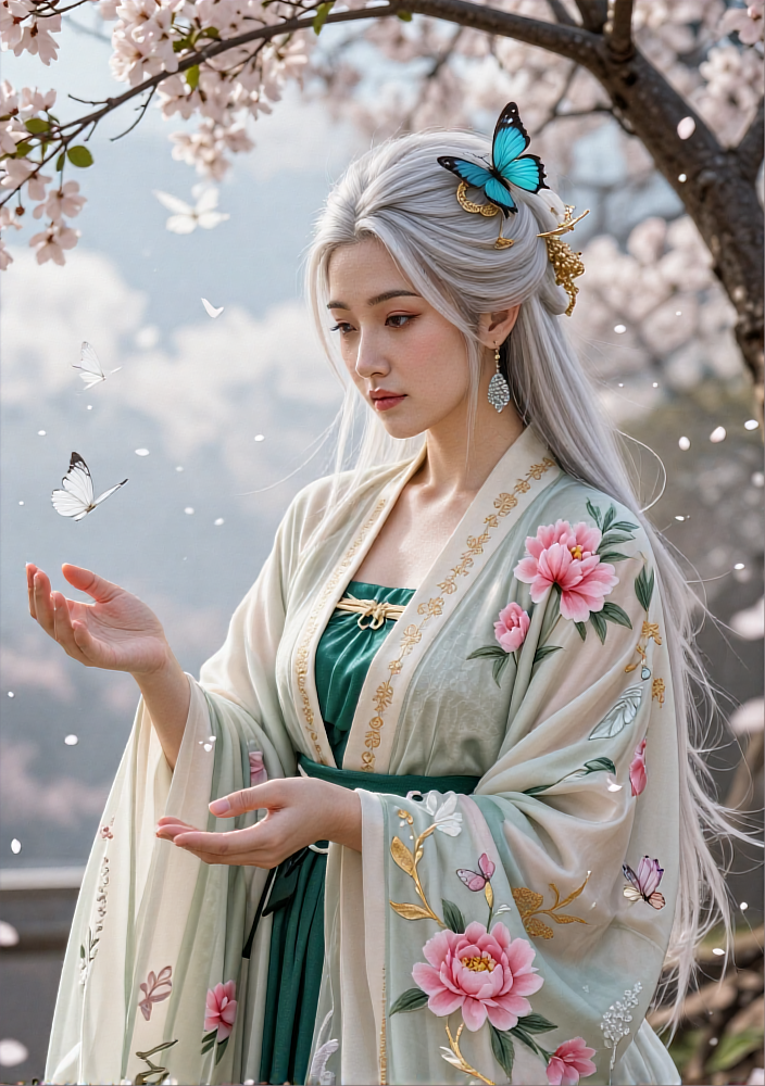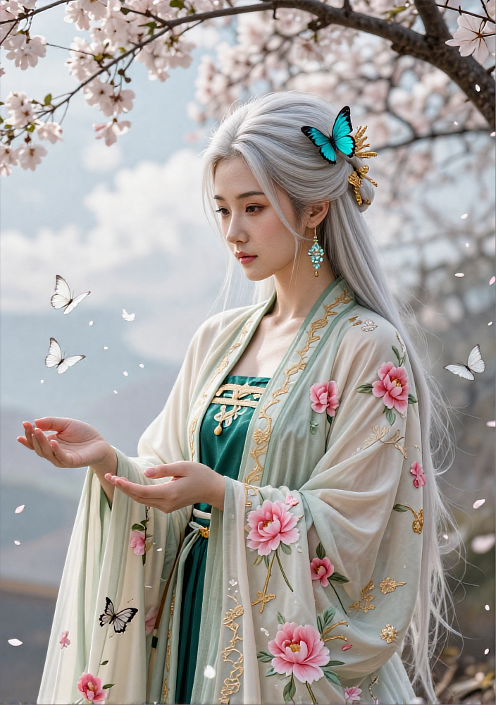 ZitCNGufHanfu, A woman with long, silvery-white hair stands gracefully beneath a blossoming tree, her gaze serene and slightly downward. She wears an ornate, layered robe in pale sage green and cream, richly embroidered with pink peonies, gold vines, and delicate butterflies; a deep emerald undergarment peeks at the neckline and waist. A turquoise butterfly rests on her hair, secured by a golden filigree headpiece, while matching dangling earrings shimmer near her jawline. Soft light filters through the sky, illuminating floating petals and several white butterflies mid-flight around her outstretched hands. The background blends soft clouds and blurred branches, evoking a tranquil, ethereal spring atmosphere.
