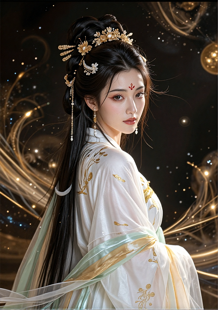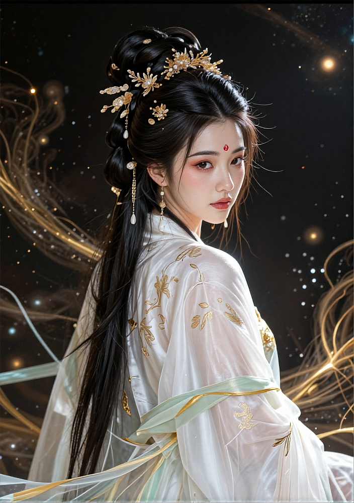 ZitCNGufHanfu, A woman with long, dark hair styled in an elaborate updo adorned with golden floral ornaments and dangling pearl earrings gazes over her shoulder. She wears a flowing white silk robe embroidered with delicate gold patterns and sheer layered sleeves, accented by translucent ribbons in pale green and gold. A small ornate red-and-gold bindi rests on her forehead. The background is a deep, starry void punctuated by swirling golden filaments and luminous orbs, suggesting a celestial or ethereal realm. Soft, directional lighting highlights her features and the sheen of her garments, creating a serene yet majestic atmosphere.