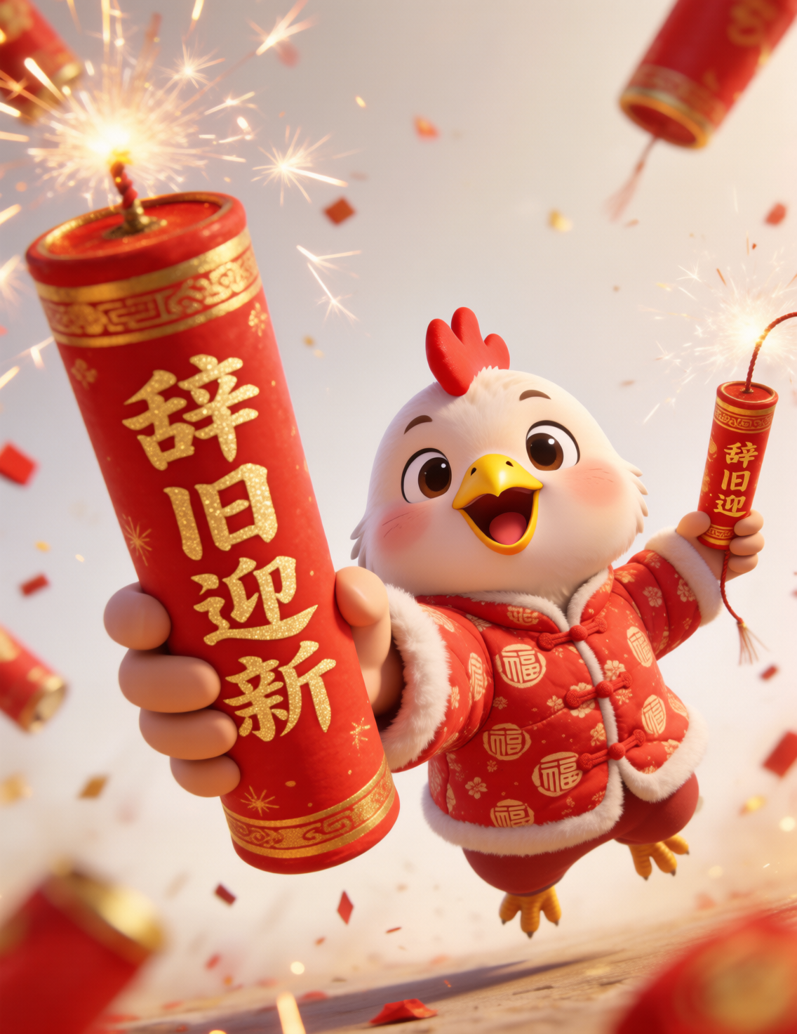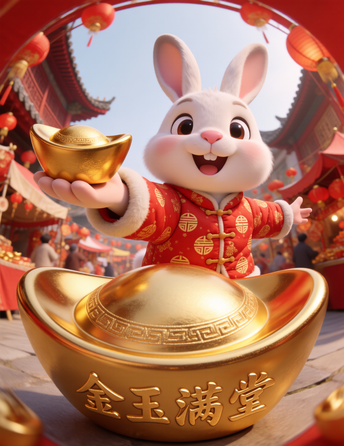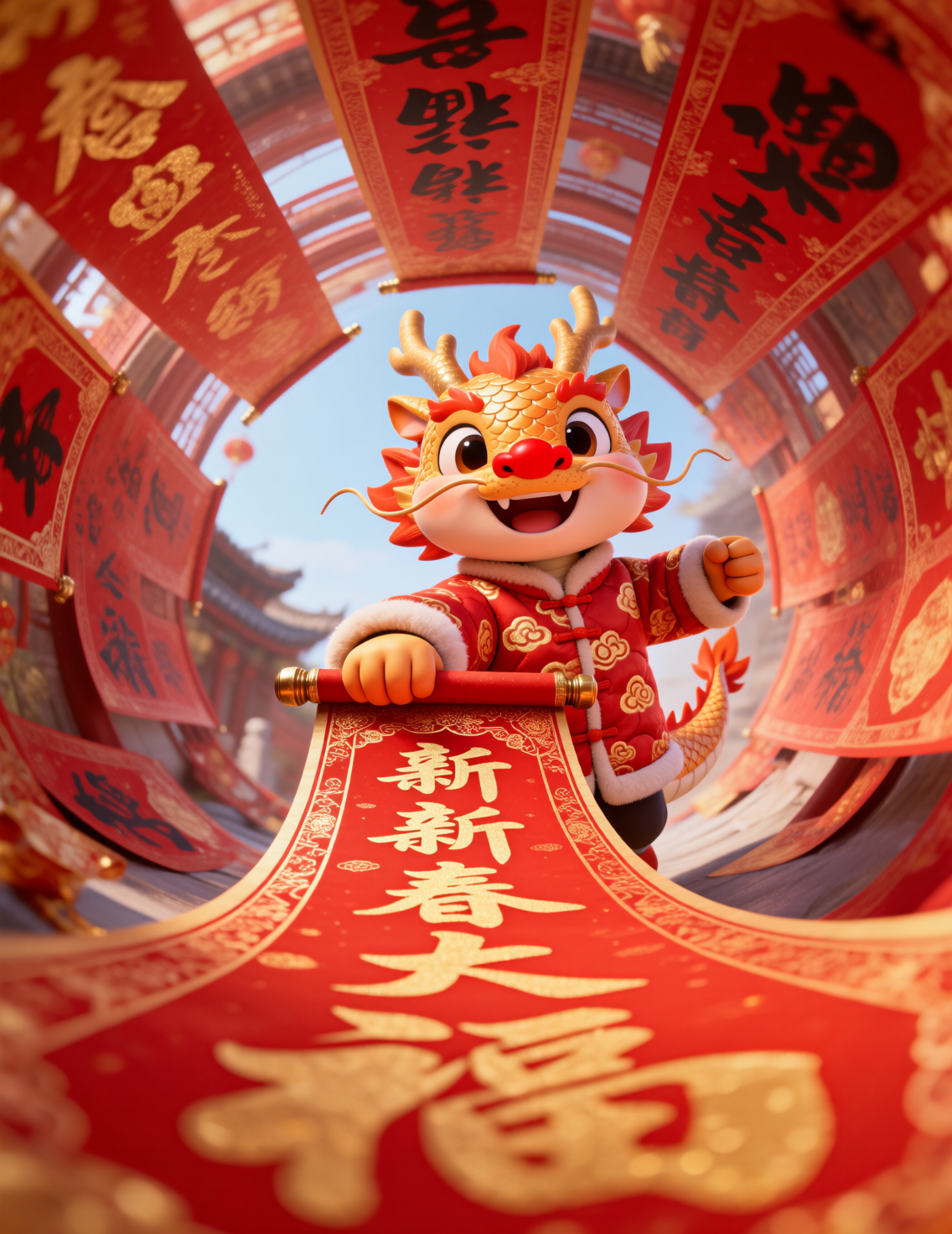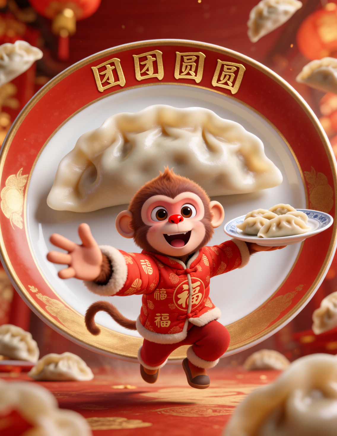 模型以萌系生肖IP+新春场景为核心风格,将龙、兔、猴、鸡、马等生肖形象转化为软萌3D卡通角色,搭配春联、金元宝、饺子、鞭炮等传统年俗元素,用鱼眼镜头营造出热闹喜庆的视觉张力。画面以红金为主色调,既保留传统年味的仪式感,又通过Q萌的角色设计传递出治愈又活泼的氛围,是打造春节营销、文创周边的高效工具。
