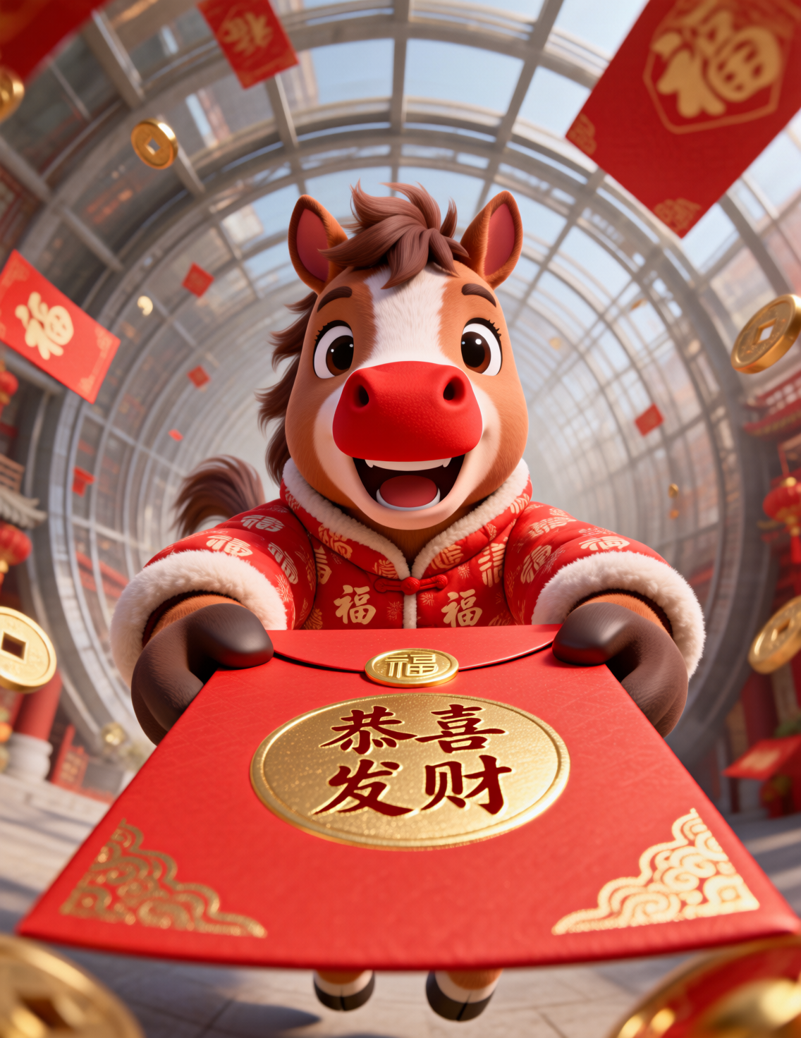 低角度仰拍,结合鱼眼镜头的畸变效果。核心主体是身着印满福字红色中式棉袄的卡通小马,它红鼻子醒目,笑容灿烂,双手捧着一个巨大的红色红包,红包上有两个金色圆形纹样,纹样内的金色字体清晰。背景是古色古香的街巷,两侧是传统中式建筑,空中悬挂着红色的祈福牌与红灯笼,金色的元宝状装饰物随风飘落,蓝天作为底色,让画面色彩更明快。红包上的金色字体为 “恭喜发财”,整体视觉风格热烈欢快,卡通形象精神抖擞,红金蓝三色搭配和谐,画面的动感与新春的喜庆氛围完美融合。