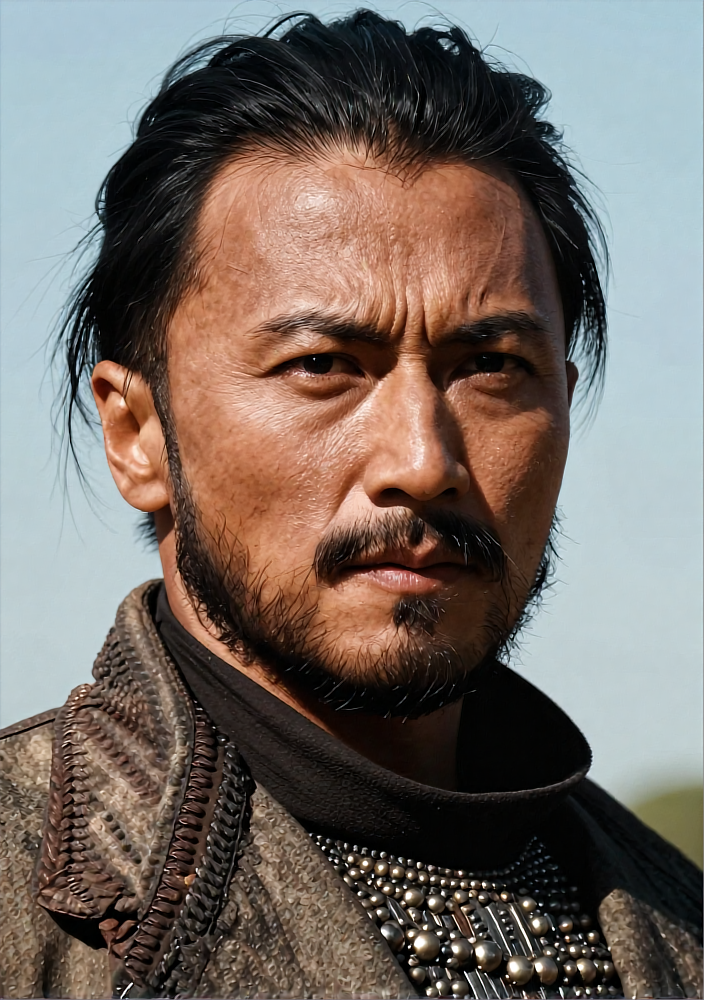 ZitDiting, A close-up portrait captures a man with dark, slicked-back hair and a trimmed mustache and goatee, his brow furrowed in intensity as he gazes slightly off-camera. Sunlight illuminates his face from the front-left, casting subtle shadows that accentuate his defined cheekbones and weathered skin texture. He wears a rugged, earth-toned garment with a high, dark collar and visible stitching along the shoulder, layered over a metallic, beaded chest piece. The background is a soft, pale blue sky, suggesting an open outdoor setting. His expression conveys resolve or quiet determination, and the overall composition emphasizes texture, natural lighting, and a stoic, grounded presence.