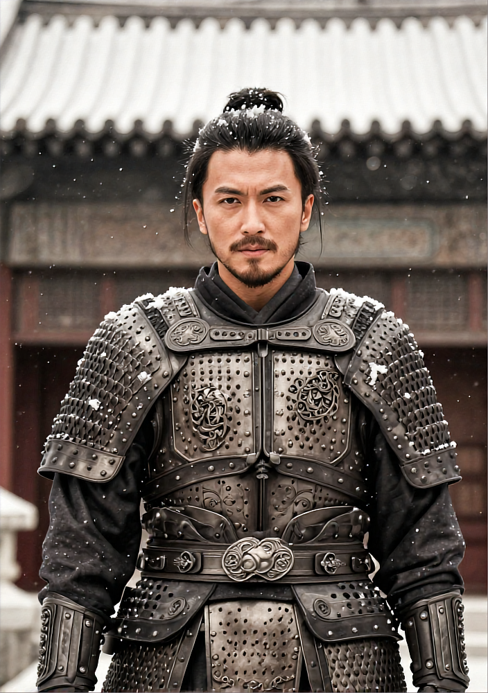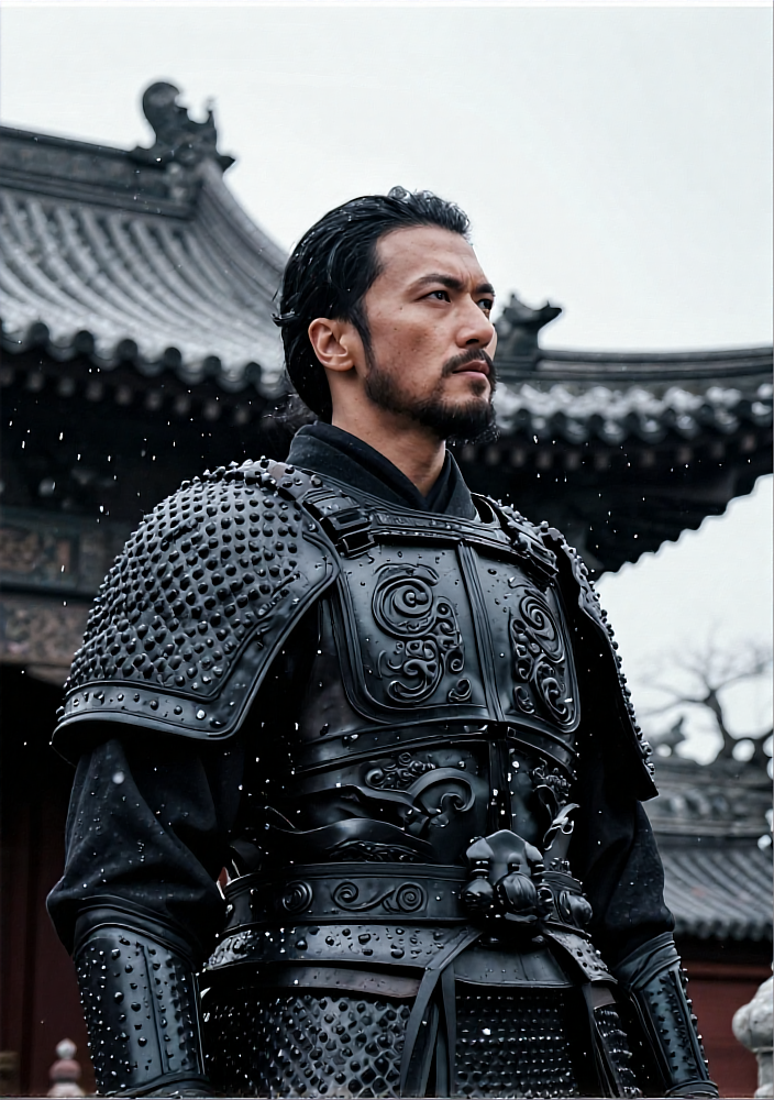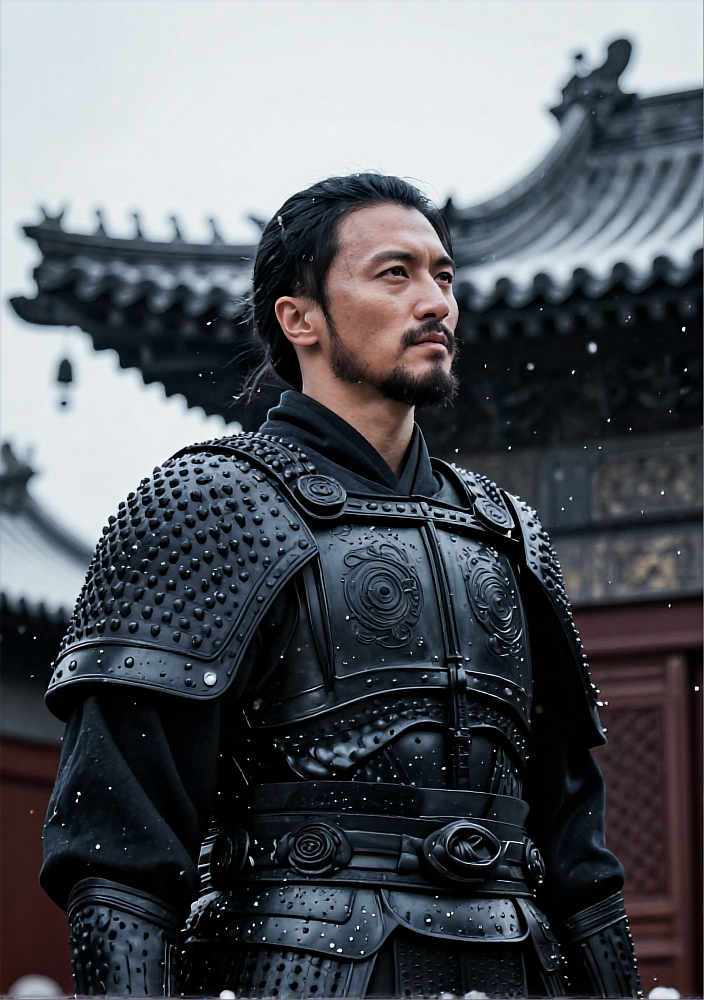 ZitDiting, A man with dark hair tied in a topknot and a mustache stands resolutely in falling snow, wearing ornate dark metal armor with overlapping lamellar plates and intricate silver filigree on the chest and shoulder guards. His expression is calm and focused, eyes fixed forward. Snowflakes cling to his hair and shoulders, while blurred traditional East Asian roof tiles with curved eaves form the background. The lighting is soft and diffused, highlighting the metallic sheen of the armor and the texture of the snow. Warm undertones contrast with the cool whites and grays, lending a solemn, cinematic atmosphere to the scene.