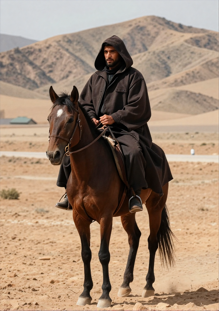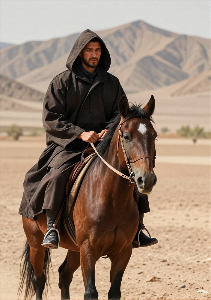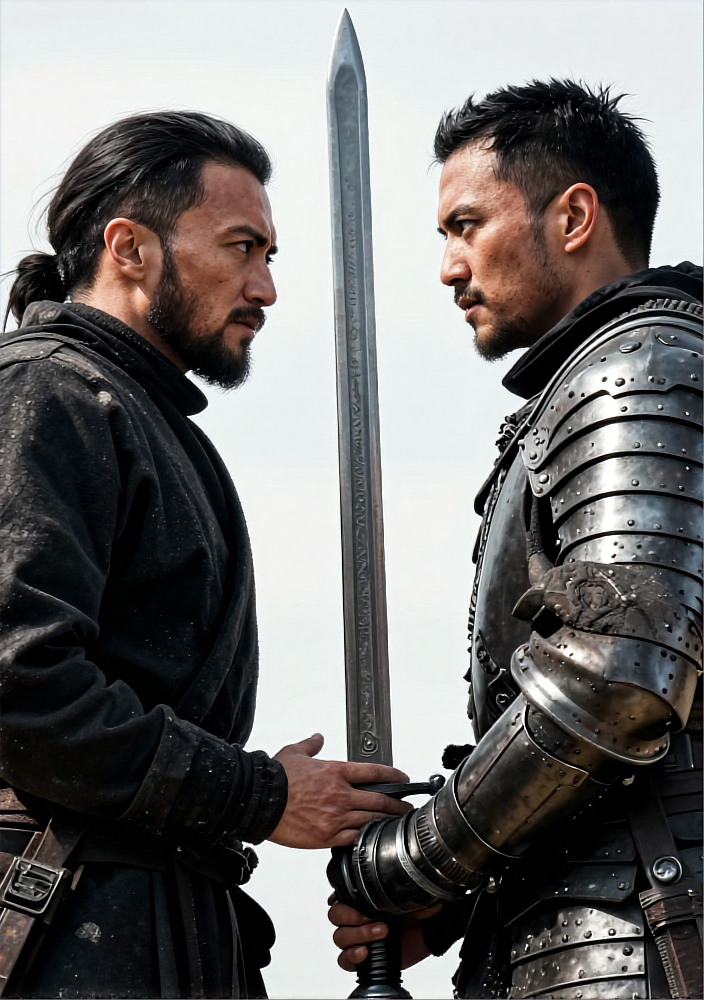 ZitDiting, Two men in dark, weathered garments face each other closely under bright daylight, their expressions tense and focused. A long, metallic sword stands vertically between them, its blade gleaming and unadorned, held firmly by the man on the right, whose hand grips a textured, ribbed hilt. His left arm is encased in intricate, segmented armor made of interlocking metal plates over thick fabric. The man on the left, with a trimmed beard and hair pulled back, places his open hand near the blade, fingers extended but not touching it. Their proximity and direct eye contact suggest an intense confrontation or solemn ritual, set against a pale, overcast sky that casts soft shadows across their rugged features and coarse textiles.