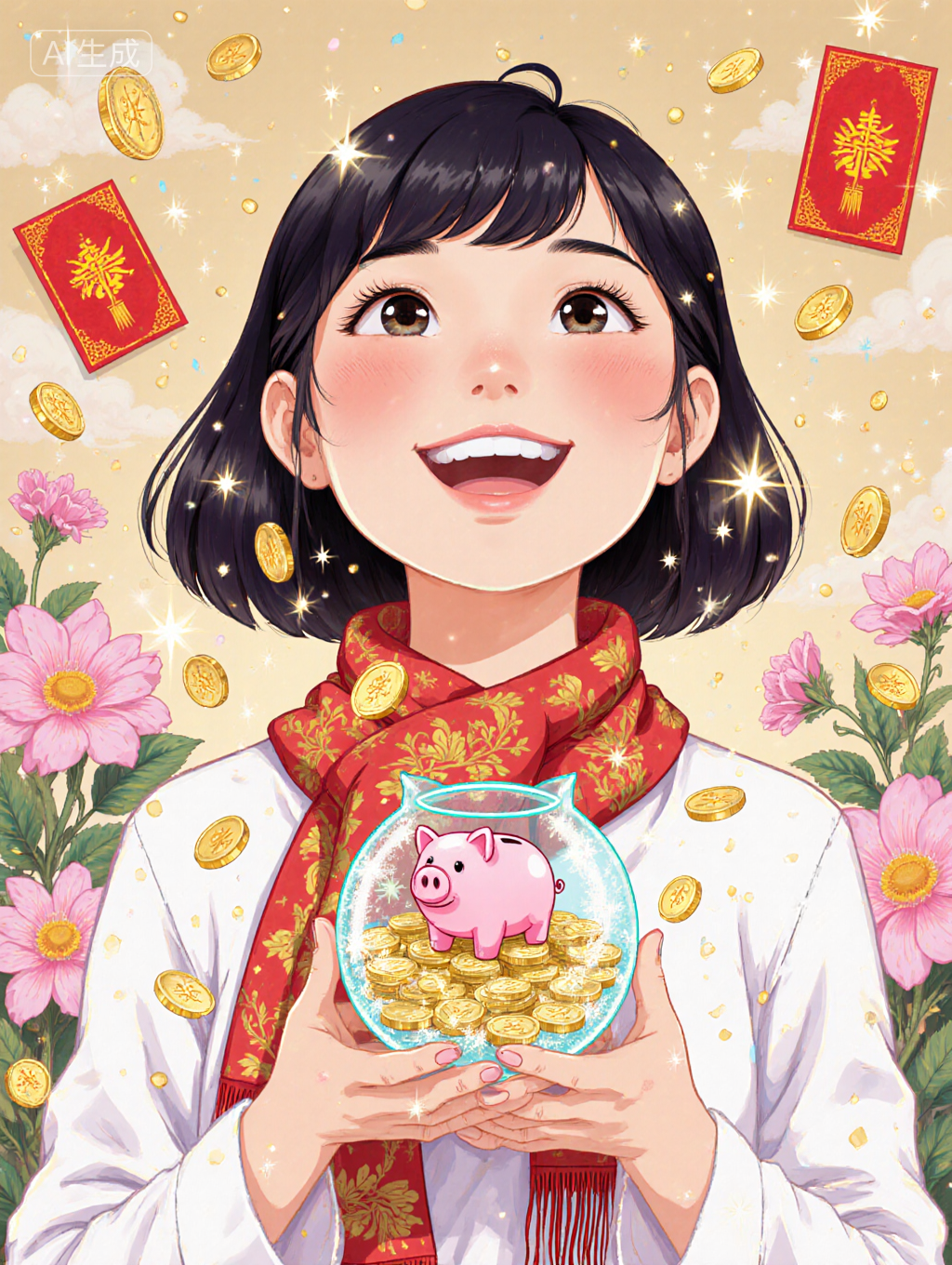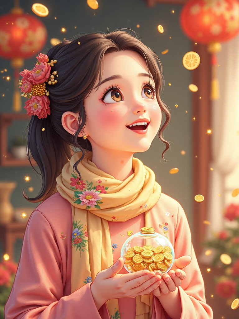 Reference Words: super realistic ,Illustrated scarf,hand drawn illustration style,Various flowers composed of star particles,3D cartoon rendering, young Asian woman's profile, smiling and looking up at the sky, hands holding a translucent frosted glass texture piggy bank, round and cute, filled with gold coins, background with golden coin petals floating, red envelopes and light particles sparkling in the air, soft glowing effect, soft light, shallow depth of field, high detail, warm festival colors, clean composition, joyful and expectant emotions, celebration theme