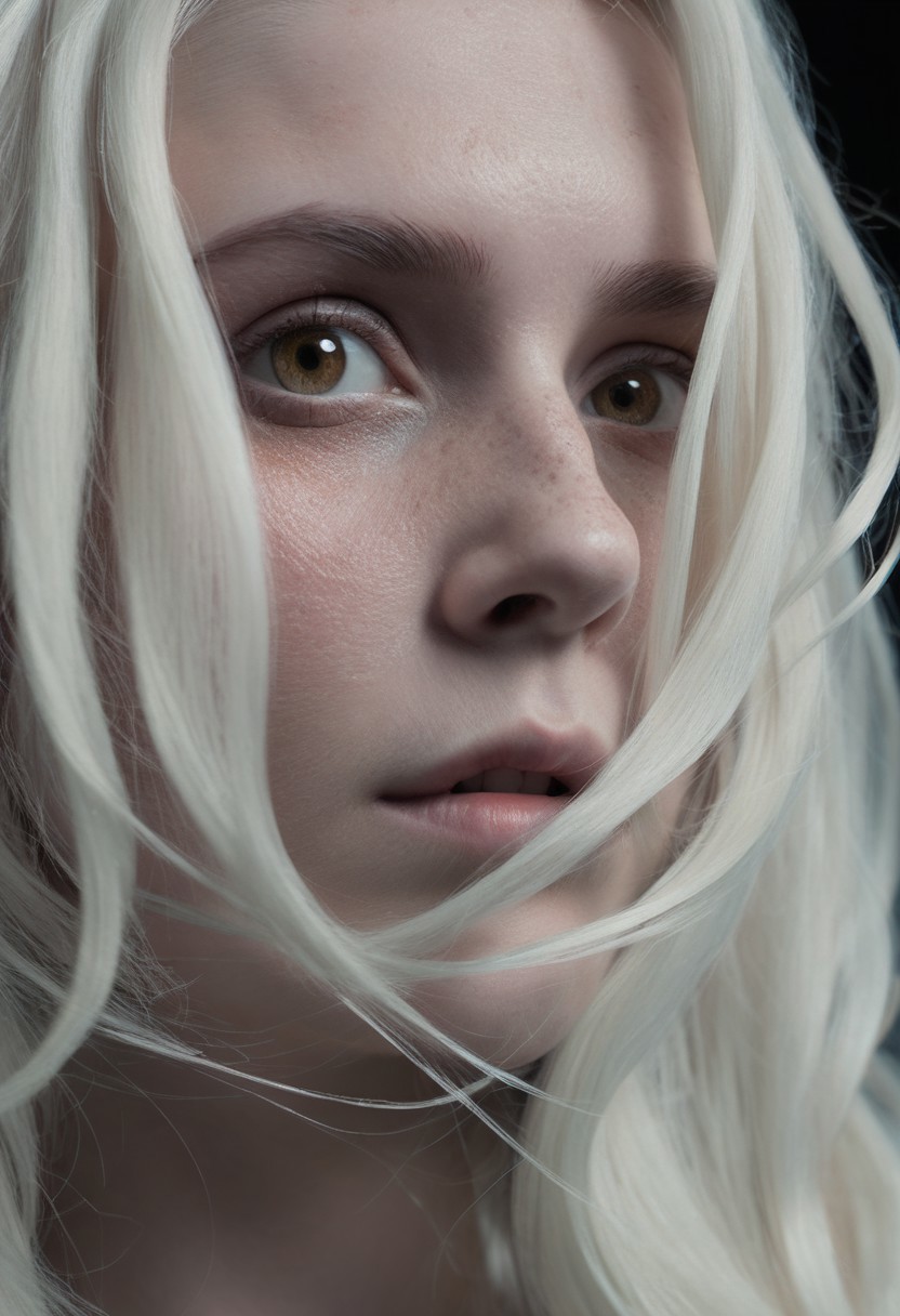 This is an extremely close-up, high-detail portrait of a woman's face, dominated by her long, flowing, almost white or platinum blonde hair. The hair is dramatically styled, with strands blowing across her face, partially obscuring one eye and much of her forehead.