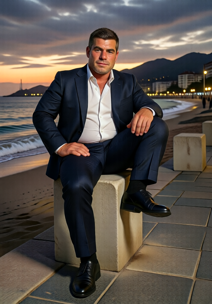 5、正向提示词:QwJPOLDFundoshi,A man with dark hair sits confidently on a light gray concrete block along a paved seaside promenade, wearing a tailored navy suit, an unbuttoned white shirt, black socks, and polished black dress shoes. His right hand rests on his hip while his left arm drapes over his knee, gaze directed forward. Behind him, gentle waves lap the sandy shore under a twilight sky streaked with soft orange near the horizon and muted blues above. Distant city lights twinkle along the coastline, with silhouetted mountains rising to the right. The scene is evenly lit by ambient dusk light, highlighting the smooth texture of the suit fabric and the clean lines of the urban waterfront setting, evoking calm sophistication.