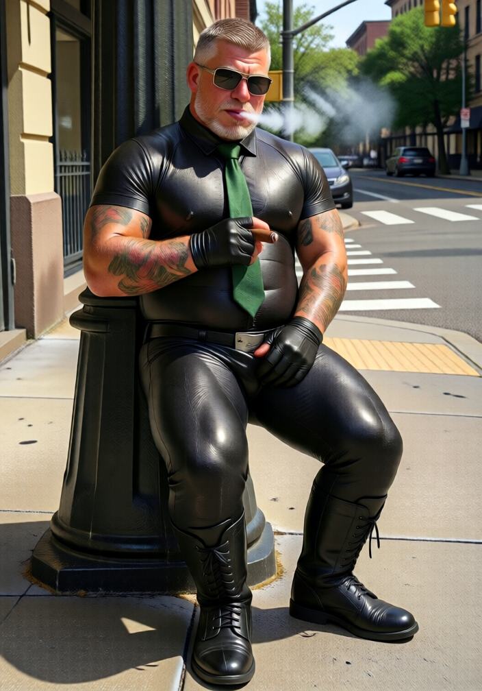 QwJPOLDFundoshi,A man with short dark hair sits confidently on a concrete ledge at a city street corner, dressed in a tailored light gray suit, white collared shirt, black belt with a silver buckle, dark socks, and polished black dress shoes. His right hand rests on his thigh while his left hand lies near his lap; he gazes slightly off-camera with a composed expression. Behind him, asphalt pavement features white lane markings and orange traffic cones, with blurred buildings, a red-lit traffic signal pole, and a parked car visible in the background. Warm sunlight casts sharp shadows to his right, highlighting the texture of his suit and the smooth surface of the ledge, creating a crisp, urban atmosphere.