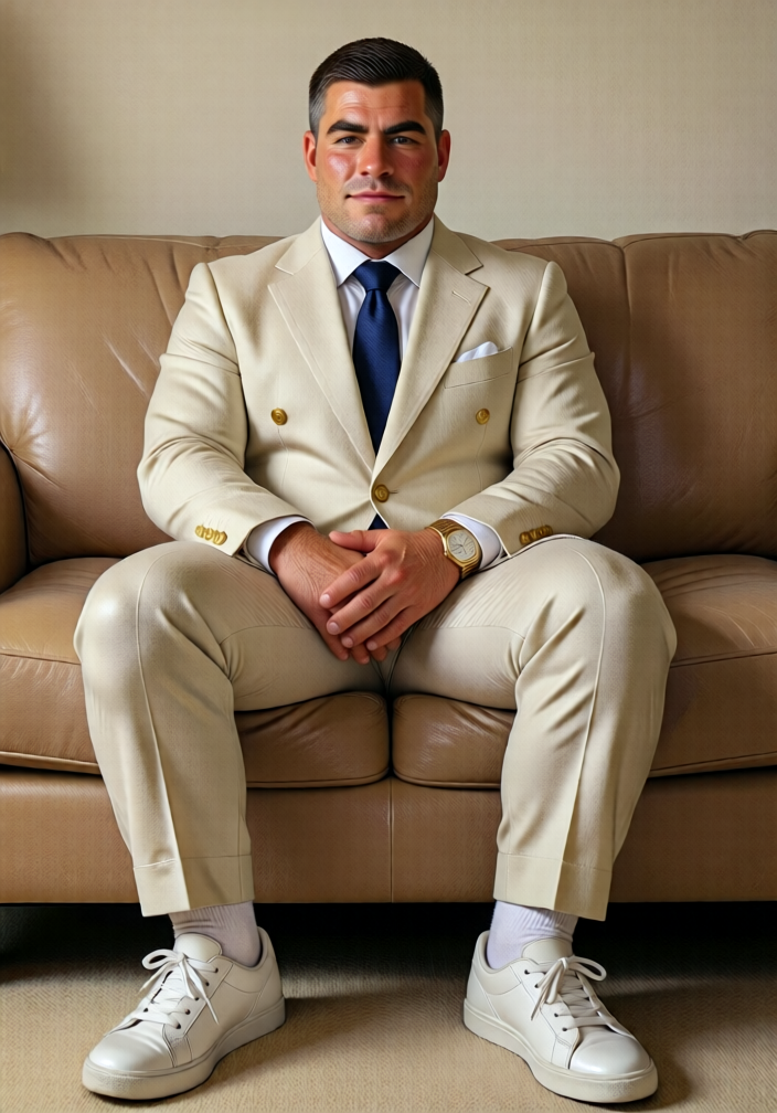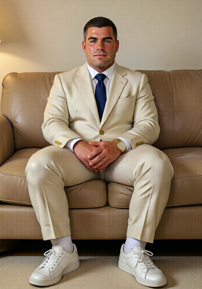 QwJPOLDFundoshi,A man with short dark hair sits upright on a beige fabric sofa, dressed in a cream-colored suit with gold buttons, a white dress shirt, and a navy blue tie. His hands rest lightly clasped over his lap, and he wears white socks and clean white lace-up sneakers. A gold-toned wristwatch adorns his left wrist. The background is a plain off-white wall, and soft, even lighting illuminates the scene without harsh shadows. The composition centers him symmetrically, conveying a calm, composed demeanor with a blend of formal tailoring and casual footwear. The sofa’s cushioning appears plush, and the floor beneath is a neutral-toned carpet.