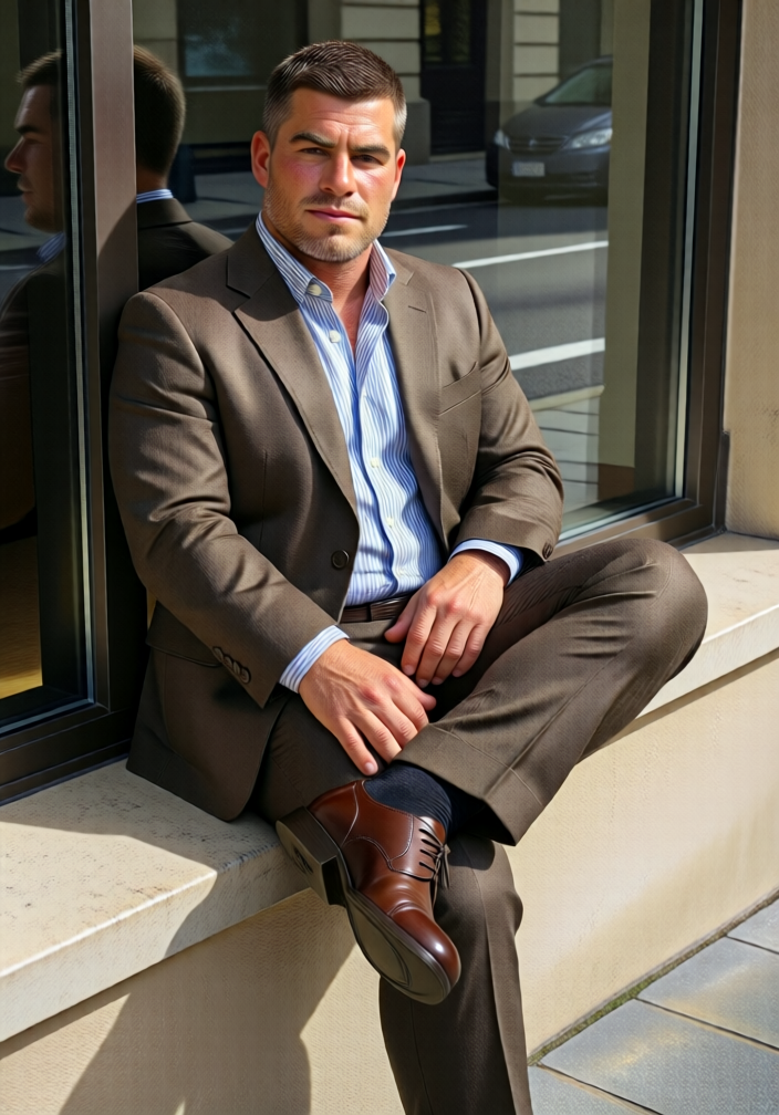 QwJPOLDFundoshi,A man with short dark hair sits confidently on a light beige concrete ledge, wearing a tailored brown suit with matching trousers, a light blue and white striped button-down shirt unbuttoned at the collar, and polished dark brown leather dress shoes with brogue detailing. His right arm rests along the ledge while his left hand rests on his thigh; his legs are crossed at the ankles. Behind him, large glass windows with dark metal frames reflect a street scene with white lane markings and a parked car. Bright daylight illuminates the scene, casting soft shadows and highlighting the texture of the fabric and the sheen of the shoes. The composition emphasizes clean lines and modern urban elegance.