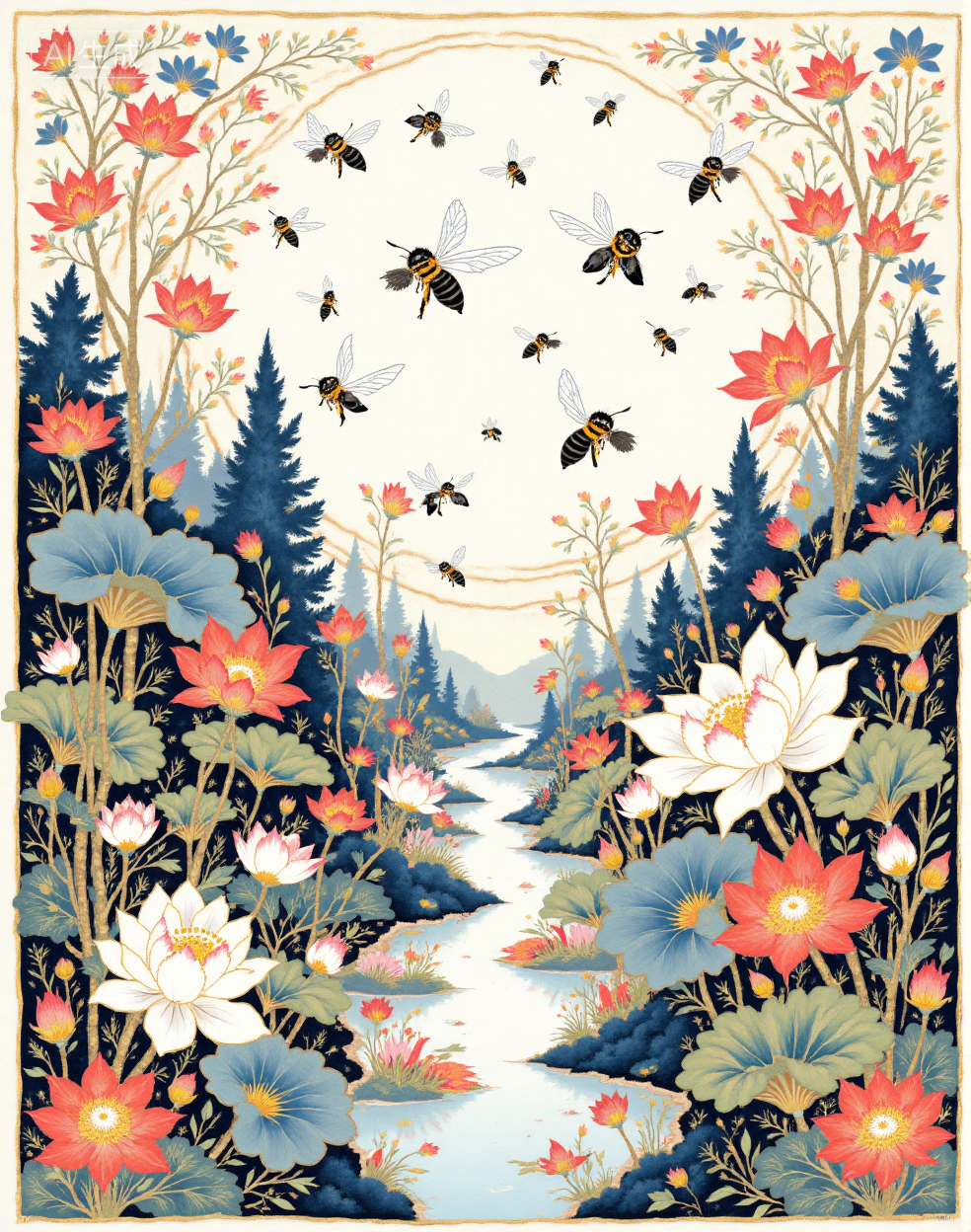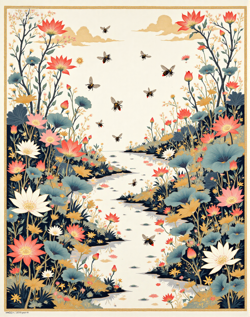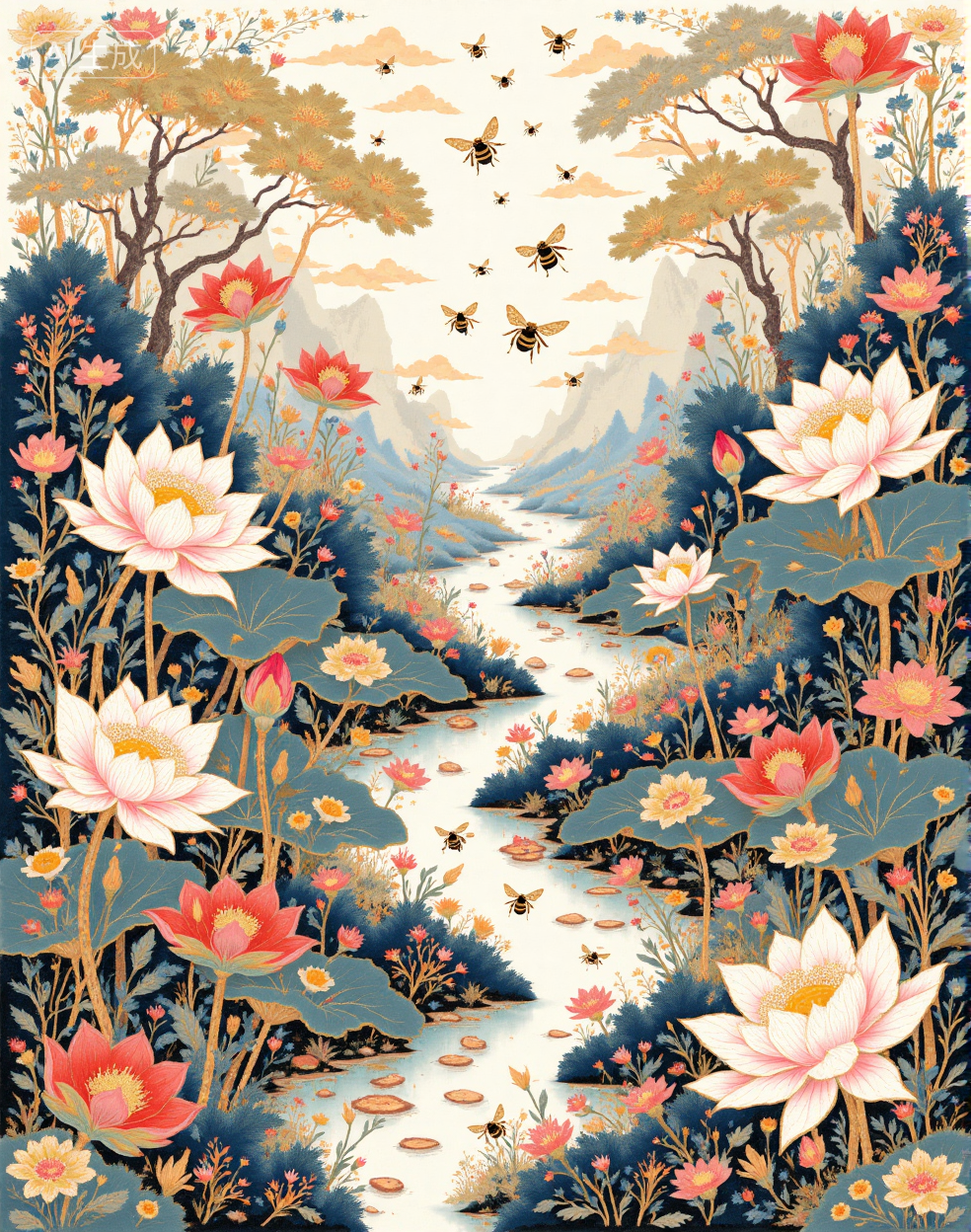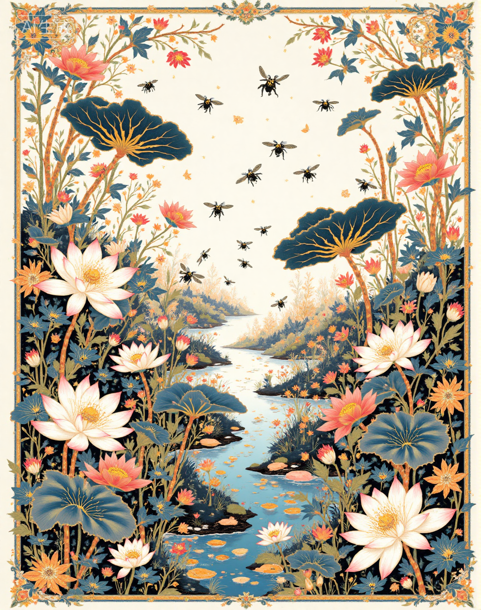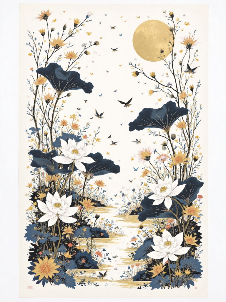 Example references: bees busily shuttle back and forth, Illustrated scarf, Chinese black and white ink painting, (blue gold color scheme:1.5), Chinese black and white ink painting, ink wash, lotus flowers, landscape, water reflection, monochrome, ink wash, artistic brush strokes, nature theme, floral art, serenity, elegance, minimalistic design, white space,