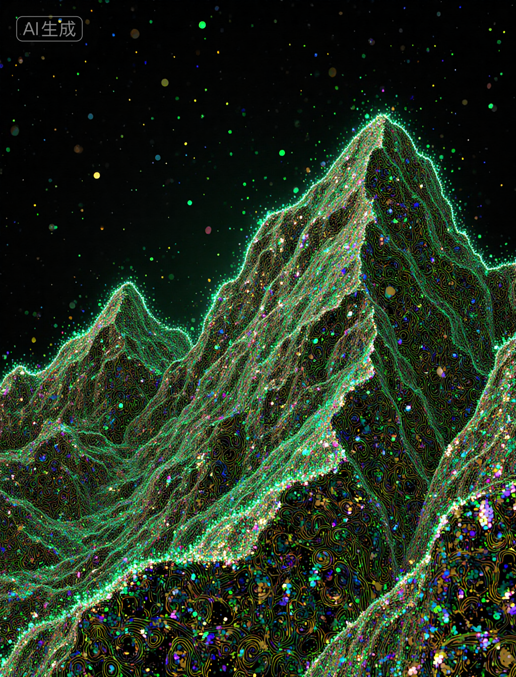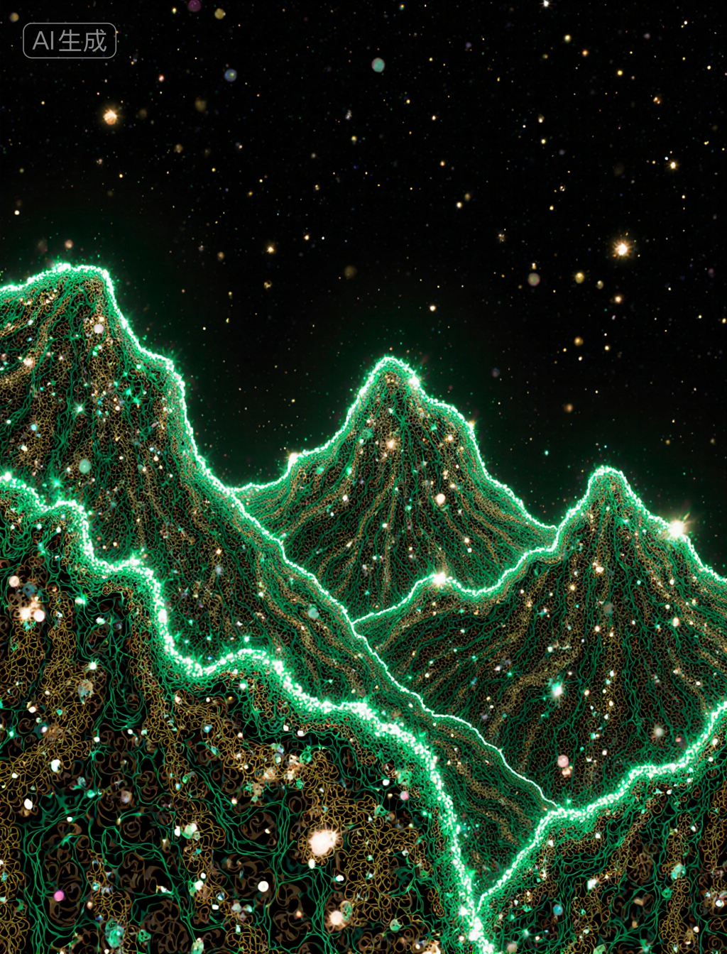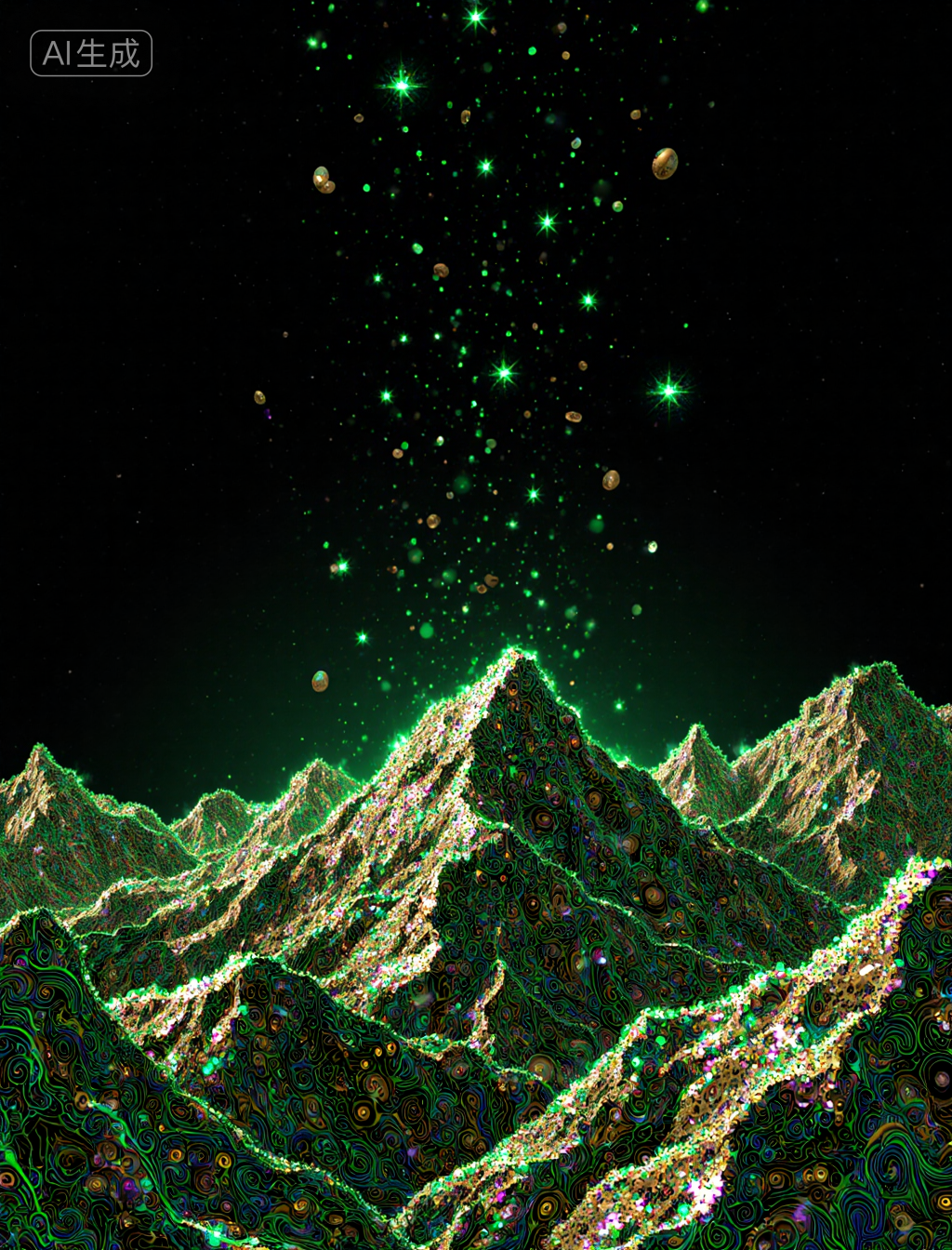 参考词:{Quantum Leap},Characteristics: Traditional themes such as mountains,8k resolution trending on artstation,Fashion magazine cover, William Morris, fairies, pop, Nick Veasey, James Turrell, by Zentangle, by pointillism, Yayoi Kusama, Op art, fractal art, emerald green and gold, sequins, high contrast, complex intricate details, magical surrealism, glowing particles, bioluminescence, inner glow, glowing lines, ultra-high definition quality light particles light particles