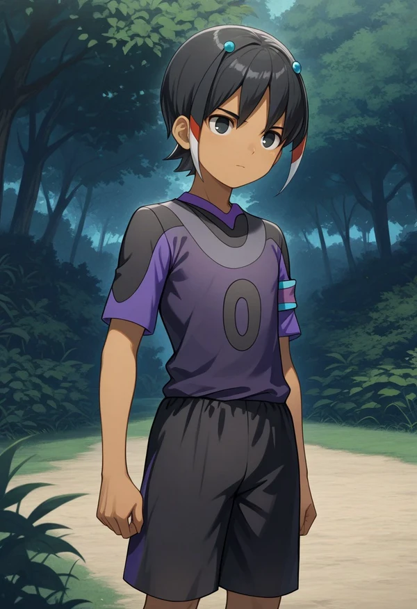 shutez, 1boy, male focus, solo, dark skin, dark-skinned male, black eyes, black hair, hair ornament, ancient dark soccer uniform, shirt, black and purple shirt, armband, short sleeves, shorts, black shorts, socks, black socks,