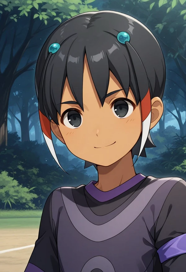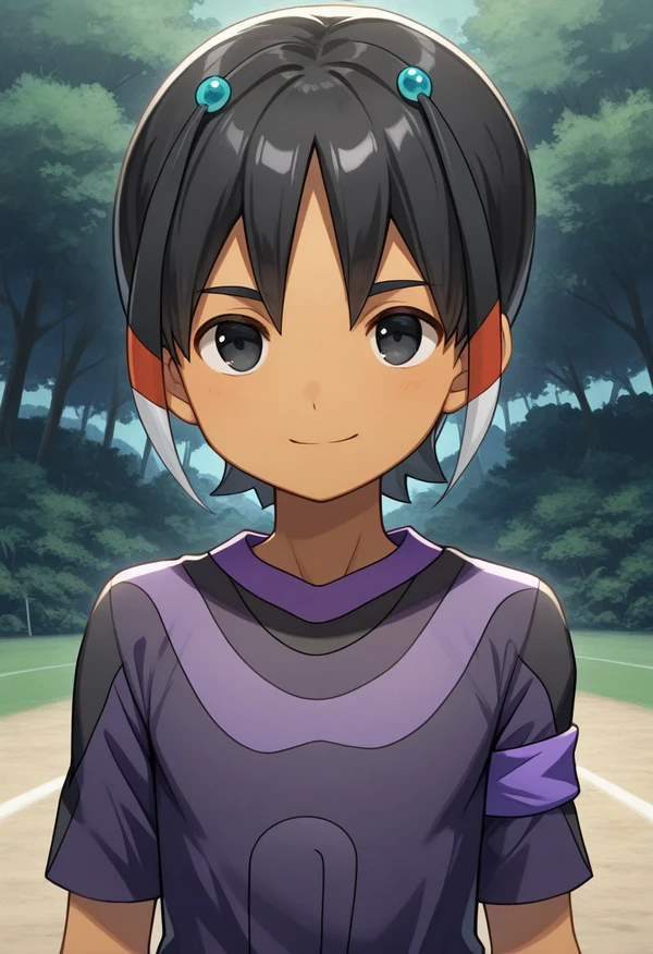 shuu, 1boy, black hair, hair ornament, black eyes, sportwear, soccer uniform, dark skin,